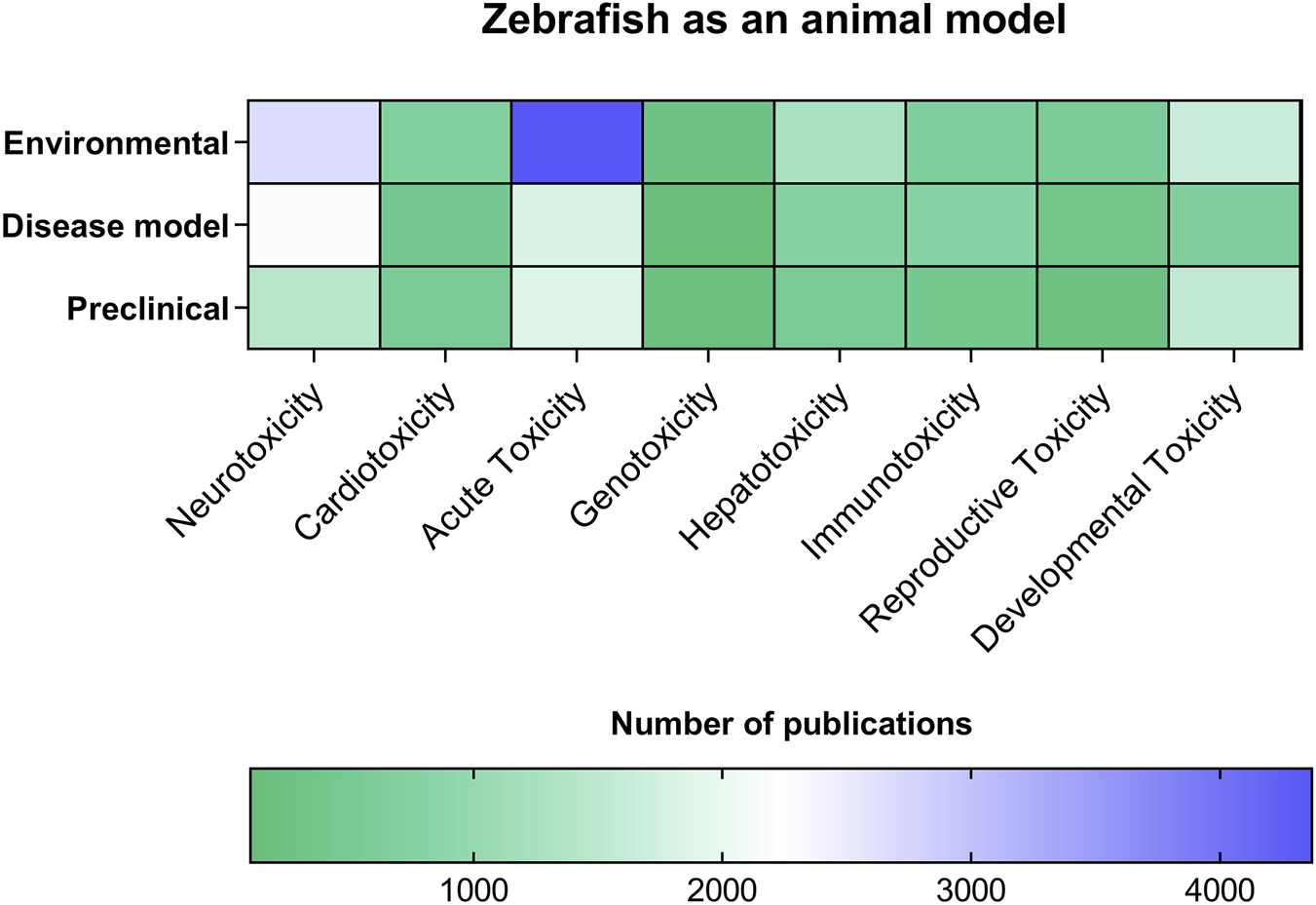 The heatmap reveals a heterogeneous distribution of scientific publications employing zebrafish across different application contexts and toxicity categories. Overall, the Disease Model context demonstrated the highest concentration of studies, particularly within the Acute Toxicity category, which exhibited the greatest number of publications (approximately 4,397), representing the most intensively explored intersection in the dataset. Neurotoxicity, hepatotoxicity, and immunotoxicity also showed substantial representation, especially within the Disease Model and Preclinical contexts, indicating a strong focus on using zebrafish to investigate systemic and organ-specific toxicological effects. In contrast, developmental and genotoxic toxicity categories displayed comparatively lower publication frequencies across all application contexts, with the lowest values observed in specific combinations reaching approximately 21 publications. The Environmental context exhibited a more uniform but generally lower distribution of studies across toxicity categories when compared to Disease Model and Preclinical applications (Figure 8). These results highlight a clear research trend toward leveraging zebrafish primarily for disease-related toxicological investigations, particularly acute toxicity, while certain toxicity domains remain comparatively underexplored.