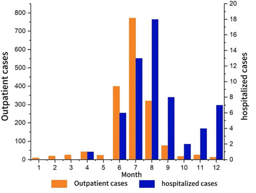 In terms of gender, the male-to-female ratio was relatively balanced. The highest number of cases and hospitalizations occurred in the 35–64 age group, with 1,077 cases (59.57%) and 27 hospitalizations (45.76%). The two deaths were reported in the 35–64 and ≥65 age groups. Regarding occupation, farmers were the most affected group, accounting for 57.36% (1,037/1,808) of total cases. Both deaths occurred in male farmers (Table 3).