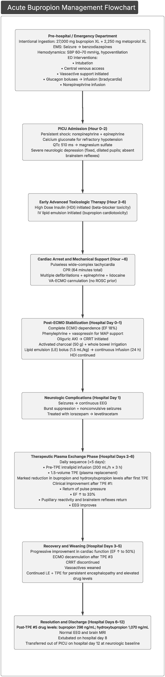 Introduction: Massive bupropion overdose in pediatric patients can result in refractory cardiogenic shock, seizures, and cardiac arrest requiring aggressive intervention. Although lipid emulsion (LE), therapeutic plasma exchange (TPE), and extracorporeal membrane oxygenation (ECMO) have been used, evidence guiding clinical management remains limited. We present a case of combined LE therapy and TPE in a pediatric patient with massive bupropion overdose.