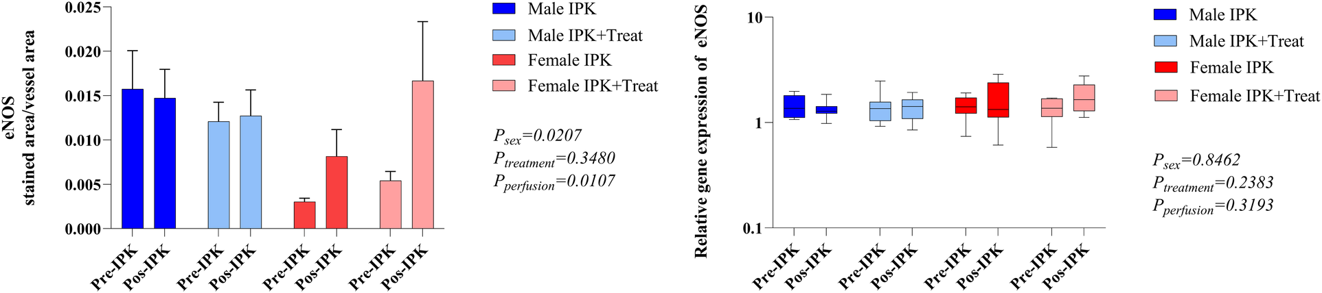 Protein expression of eNOS and endothelin-1 in kidney tissue. IPK, kidneys that underwent isolated perfusion without treatment; IPK + Treat, kidneys that underwent isolated perfusion with treatment of 17β-estradiol and methylprednisolone. Results are presented as mean and standard error of the mean. Results analyzed using three-way ANOVA. eNOS, endothelial nitric oxide synthase.