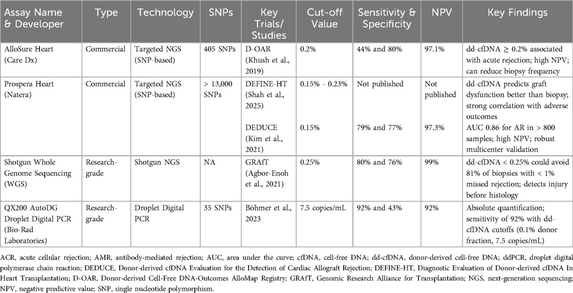 Cell-free DNA is released into the bloodstream with cell death due to normal cell turnover or disease processes (21). Normally, healthy individuals have small amounts of cfDNA, most of which is released by hematopoietic cells with a small amount released from the heart (22). In organ transplant recipients, it was hypothesized that acute rejection leads to cell death in the allograft resulting in elevated levels of dd-cfDNA in the blood of transplant recipients (17). The clinical use of earlier techniques such as shot-gun sequencing and targeted quantification using polymerase chain reaction were impractical due to cost, complexity, requirement of previous genotyping of both donor and recipient, and sex-mismatch between the donor and recipient (23). These limitations were overcome with the advent of targeted amplification. Allosure (CareDx, Inc., Brisbane, CA) is a targeted amplification sequencing assay which has been analytically and clinically validated to quantify the percentage of dd-cfDNA in the transplant recipients’ blood (18). This technique was first utilized in the D-OAR study to target highly polymorphic single nucleotide polymorphisms (SNPs) to distinguish dd-cfDNA from recipient-derived cfDNA (rd-cfDNA) (24). The Allosure assay currently includes a panel of 405 SNPs. Another commercially available assay is the Prospera test (Natera, Inc., Austin, TX), validated for clinical use in the DEDUCE trial in 2021, and includes more than 13,000 SNPs (20). Table 1 summarizes the commercially available and research grade dd-cfDNA assays.