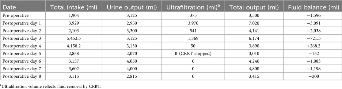 Pre-CRRT, the patient exhibited fluid overload (cumulative balance +2.5 L), metabolic acidosis (pH 7.25, BE −6.6 mmol/L), and worsening creatinine (peak 97 µmol/L). CRRT was initiated with CVVHDF, resulting in improved acid-base balance (pH 7.41, BE +0.6 mmol/L) and volume status (net negative balance by POD 3).
