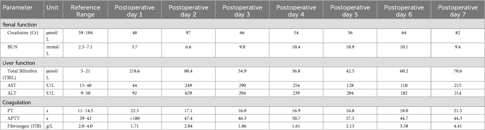 This synergistic support created a physiological window for graft recovery, evidenced by declining bilirubin (312.2 → 70.6 μmol/L) and normalized coagulation (PT: 26.3 → 16.8 s).