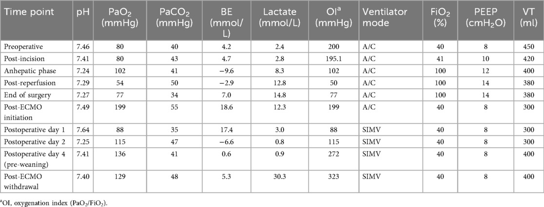 A 27-year-old male with untreated chronic hepatitis B and alcoholic liver disease presented to an outside hospital on 2023-05-07 with 6 days of progressive jaundice, blurred vision, and left lower abdominal pain. Initial diagnoses included chronic viral hepatitis B, alcoholic optic neuropathy, alcoholic liver disease, and acute liver failure. After 48 h of conservative management without improvement, he developed impaired consciousness and agitation, prompting emergency transfer to our ICU on 2023-05-09. Preoperatively, the patient had moderate ARDS with a PaO2/FiO2 ratio of 200 mmHg. Although this represented significant hypoxemia, it was deemed temporarily acceptable for proceeding with surgery, and protective ventilation with fluid restriction was maintained. Given the considerable complexities and risks associated with intraoperative ECMO management during liver transplantation—such as anticoagulation-related bleeding and technical interference—the decision was made to proceed without preoperative ECMO bridge therapy.