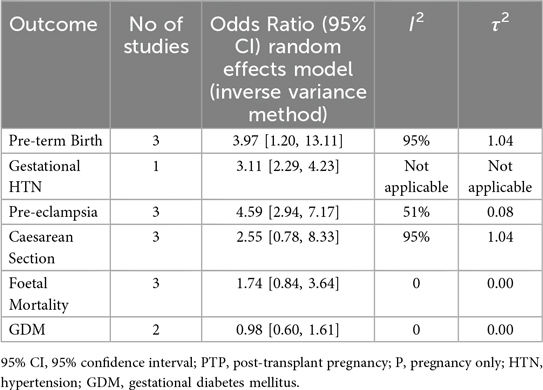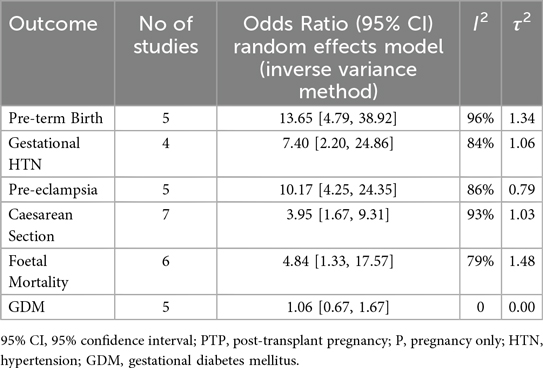 This comparative systematic review and meta-analysis confirm that pregnancy is feasible after kidney transplantation but is associated with increased maternal and fetal risks. Notably, pre-eclampsia was strongly linked to post-transplant pregnancies (OR: 4.59, 95% CI: 2.94–7.17), with significantly higher rates of gestational hypertension and preterm birth in the exposed group. These findings align with existing epidemiological data, including the UK Transplant Pregnancy Registry (UKTPR) (11) which reported a 36% prevalence of gestational hypertension and pre-eclampsia in transplant pregnancies—representing a six-fold increase compared to the general population. Furthermore, two large systematic reviews and meta-analyses have documented similar rates of pre-eclampsia, with pooled prevalence estimates of 21.5% (95% CI, 18.5–24.9) (7) and 27.0% (95% CI, 25.2–28.9) (8), reinforcing the heightened risk in this population. In contrast, other studied outcomes, including caesarean section, fetal mortality, and gestational diabetes mellitus (GDM), did not differ significantly between post-kidney transplant pregnancies and healthy pregnancies. It is notable that in our study, the associations with caesarean section and fetal mortality observed in the main analysis did not remain statistically significant in sensitivity analyses. This suggests that these findings may be more vulnerable to confounding and study heterogeneity and should therefore be interpreted with caution. In contrast, the associations with pre-eclampsia and preterm birth remained consistent, reinforcing the robustness of these outcomes.