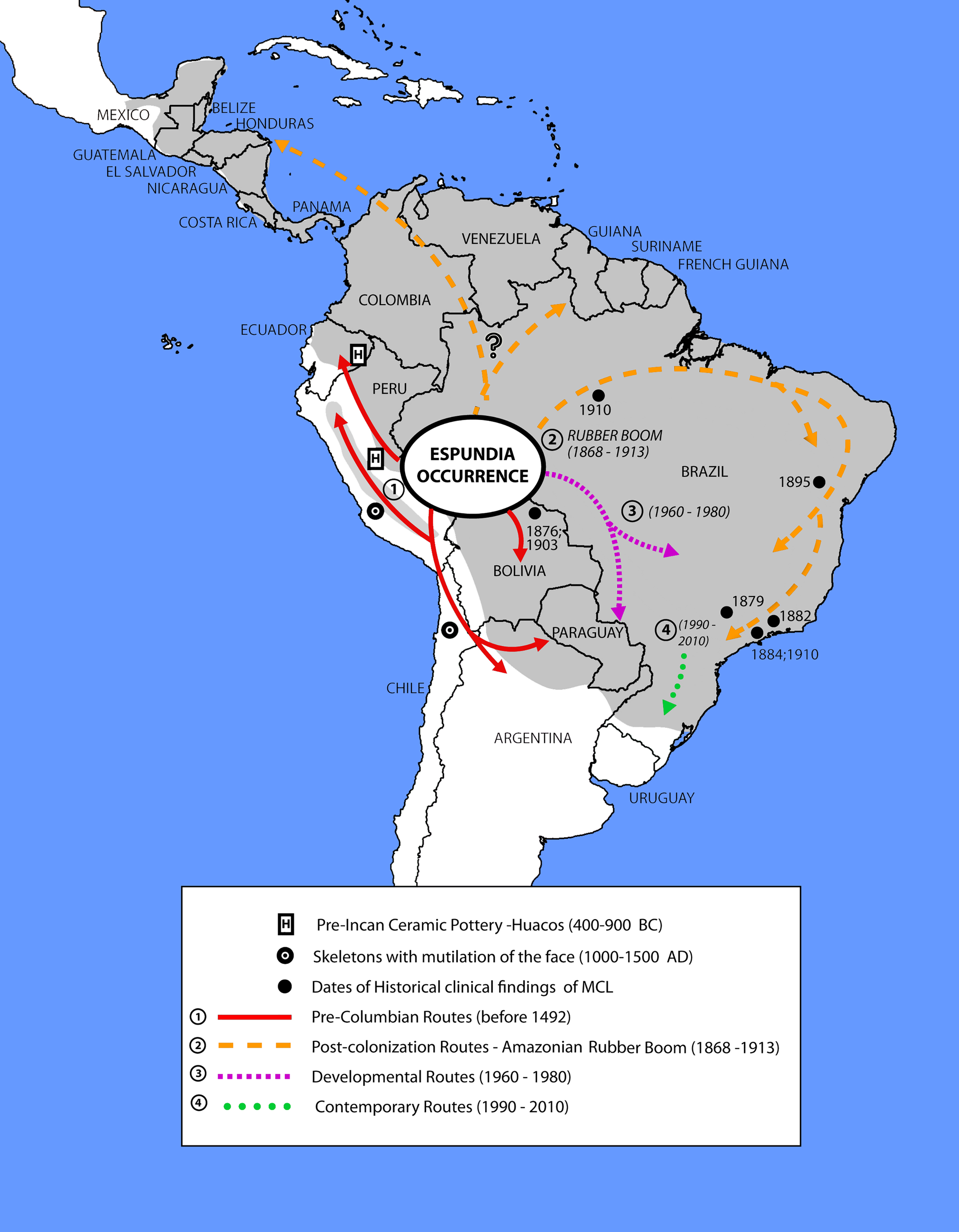 Figure 1 shows a map with archeological, paleopathological, and clinical/historical findings and possible dispersal routes for L. (V.) braziliensis in the Americas.