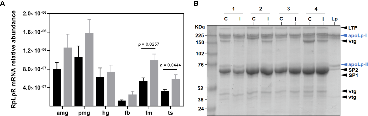 The highest abundance of RpLpR (RPRC011390) mRNA was found in the midgut compartments, while the lowest level was detected in fat bodies. In non-infected insects, low abundances were also detected in the flight muscle, and testes (Figure 1A). A trend for increased LpR mRNA levels in all R. prolixus organs towards T. cruzi infection was observed (Figure 1A). T. cruzi upregulated RpLpR mRNA levels, which were only significantly different in the flight muscle (p = 0.0257) and testes (p = 0.0444).