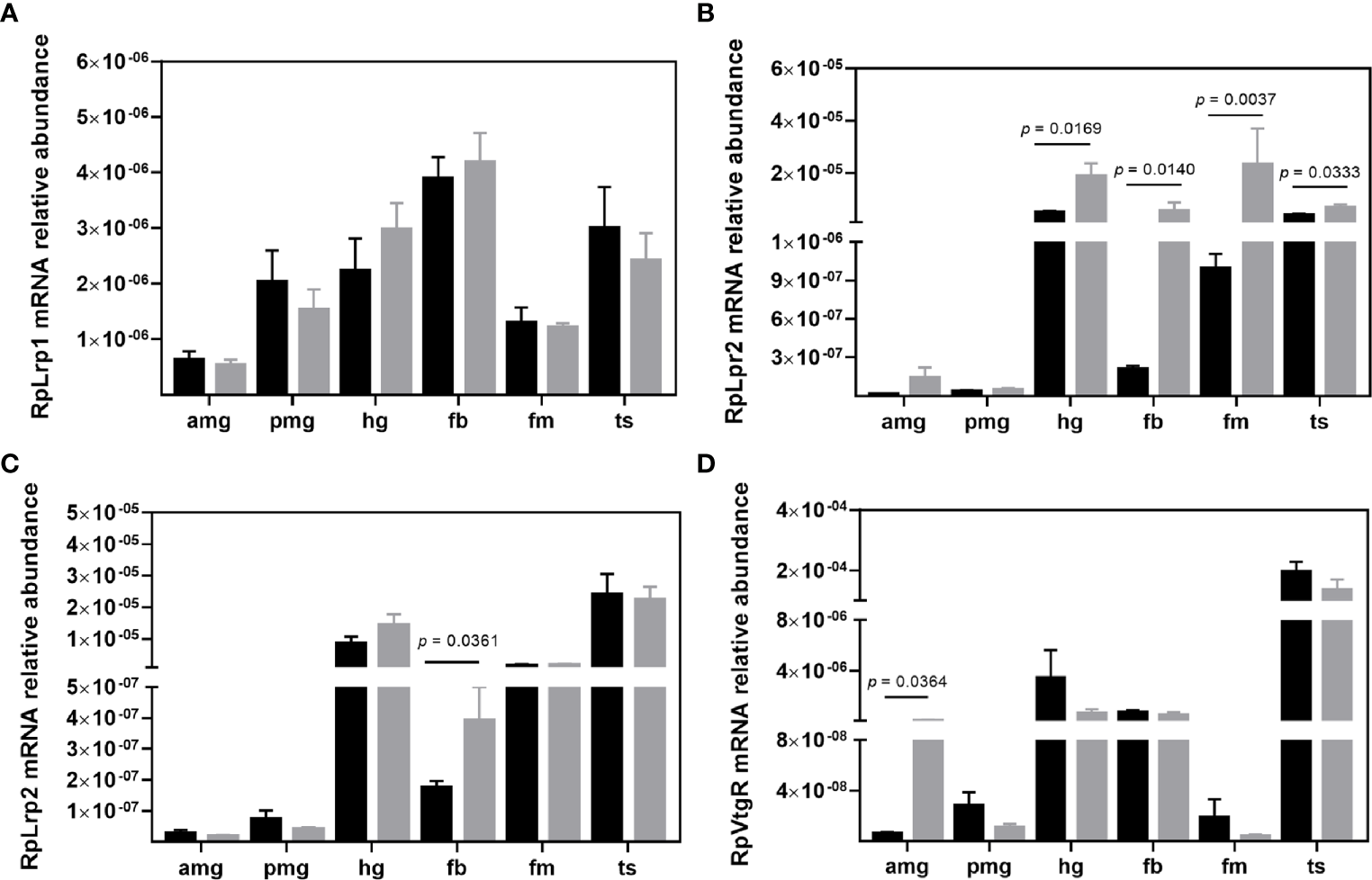 Transcript abundance of LDLR family members in R. prolixus males. mRNA levels of (A) RpLrp1 (RPRC000138), (B) RpLrp2 (RPRC000060), (C) RpLrp2 (RPRC000281), and (D) RpVtgR (RPRC000551) in individual triatomine organs. Analyses were performed using qRT-PCR and the 2−ΔCT method, with Rp18S as the reference gene. Data are displayed as means ± S.E.M. from eight replicates with a t-test for parametric data comparing control (black columns) against T. cruzi infected (grey columns) insects. Amg, anterior midgut; pmg, posterior midgut; hg, hindgut; fb, fat bodies; fm, flight muscle; and ts, testes.