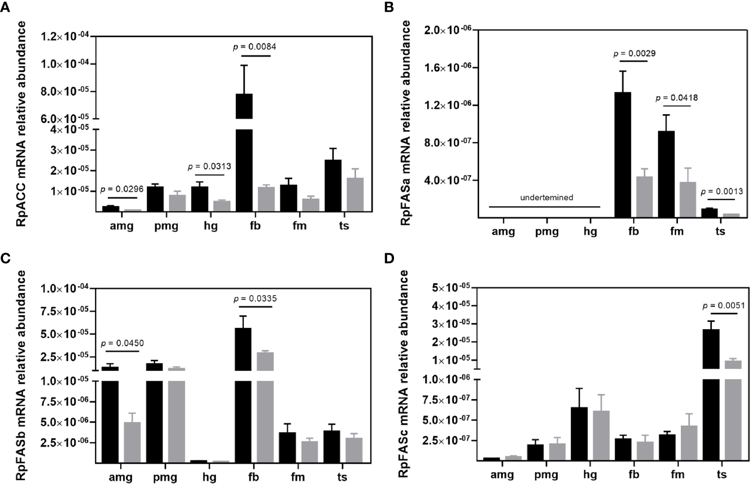 Transcript abundance of de novo fatty acid synthesis enzymes in R. prolixus males. mRNA levels of (A) RpACC, (B) RpFASa, (C) RpFASb, and (D) RpFASc in individual triatomine organs. Analyses were performed using qRT-PCR and the 2−ΔCT method, with Rp18S as the reference gene. Data are displayed as means ± S.E.M. from eight replicates with a t-test for parametric data comparing control (black columns) against T. cruzi infected (grey columns) insects. Amg, anterior midgut; pmg, posterior midgut; hg, hindgut; fb, fat bodies; fm, flight muscle; and ts, testes.