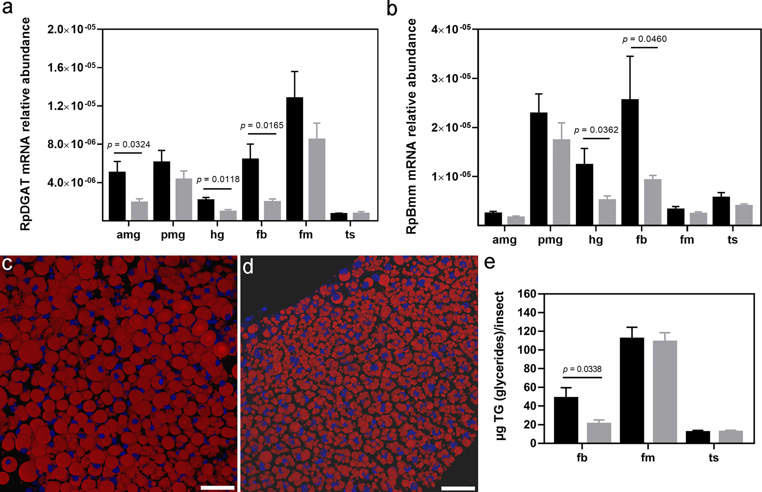 Given the importance of lipid storage for hematophagous insect physiology, enzymes related to TG storage and degradation, as well as TG itself, were investigated. Although identified in all evaluated organs, the highest RpDGAT (RPRC003808) (39) transcript level was detected in flight muscle. T. cruzi infection induced a downregulation of this mRNA in the anterior midgut (p = 0.0324), hindgut (p = 0.0118), and fat body (p = 0.0165) (Figure 4A). The Bmm lipase (39) catalyzes the DGAT opposite reaction, and in R. prolixus males the highest abundance of its mRNA was found in the posterior midgut, hindgut, and fat body. Infected insects presented a reduction in RpBmm (RPRC002097) mRNA levels in the hindgut (p = 0.0362) and fat body (p = 0.0460) (Figure 4B).