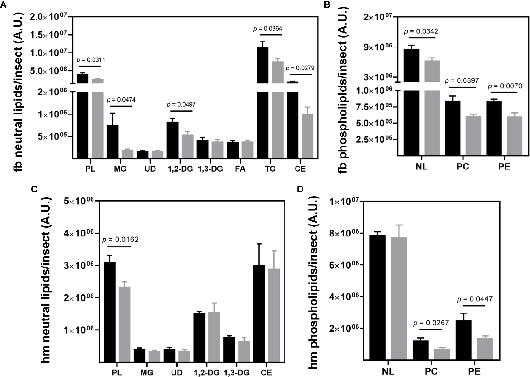 Lipid composition of R. prolixus male fat bodies and hemolymph. Levels of (A, C) neutral lipids and (B, D) phospholipids in the fat body (A, C), and hemolymph (B, D) of the triatomine. Lipids were extracted, separated, and identified by chromatography for subsequent densitometric analysis. Data are displayed as means ± S.E.M. expressed in arbitrary units (A. U.) from eight replicates with a t-test for parametric data comparing the lipid levels of control (black columns) against T. cruzi infected (grey columns) insects. Fb, fat bodies; hm, hemolymph; PL, phospholipids; MG, monoacylglycerol; UD, undeterminate lipid; 1;2-DG, 1;2-diacylglycerol (and cholesterol); 1,3-DG, 1,3-diacylglycerol; FA, fatty acid; TG, triacylglycerol; CE, cholesteryl ester; NL, neutral lipid; PC, phosphatidylcholine and PE, phosphatidylethanolamine.