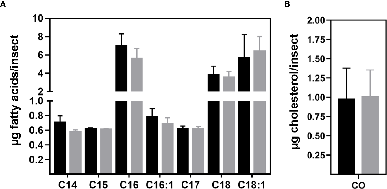 Lipids extracted from the fat bodies were subjected to mass spectrometry analyses for FA and sterol composition determinations. For the FA profile, lipids were prepared and analyzed according to Kluck et al., 2018 (33), whereas sterol composition was determined by generating saponified and non-saponified samples, as described by Pereira et al., 2011 (20).