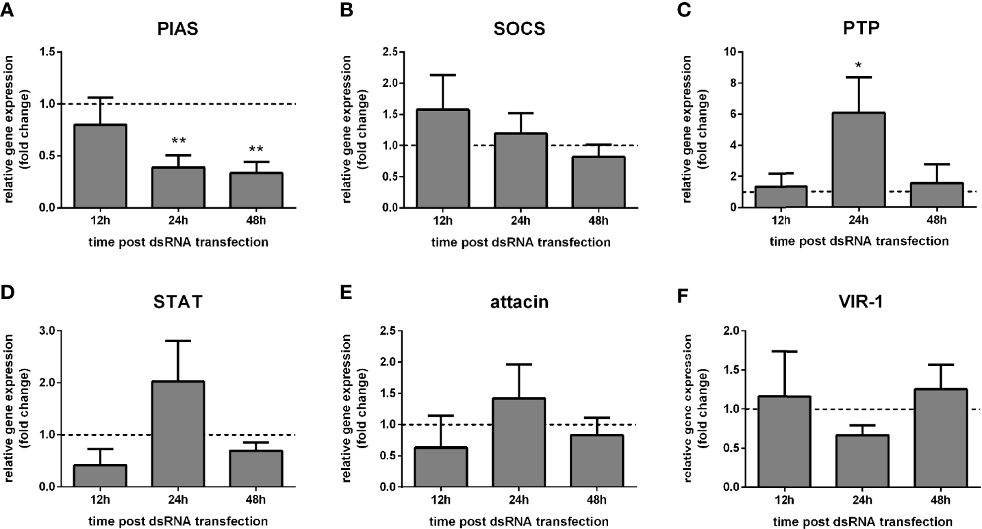 We observed that PIAS silencing was significantly achieved at 24 h and 48 h post dsRNA transfection compared to the control group transfected with LacZ dsRNA (Figure 1A). The expression of the putative repressor SOCS did not alter significantly (Figure 1B), while the repressor PTP61F was significantly increased at 24 h (Figure 1C). The putative STAT transcription factor, attacin, and VIR-1 showed no significant alteration after the PIAS dsRNA transfection (Figures 1D–F).