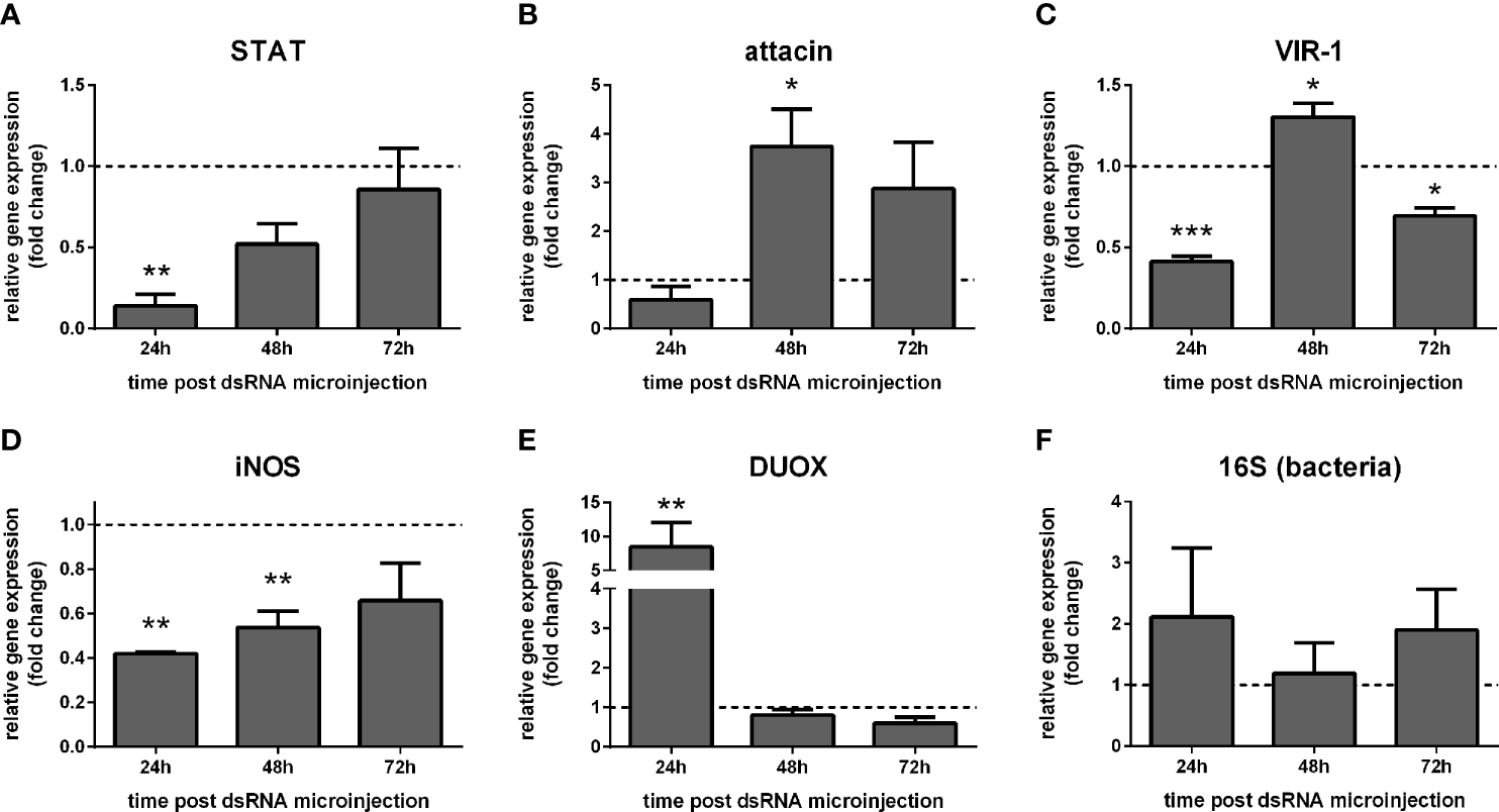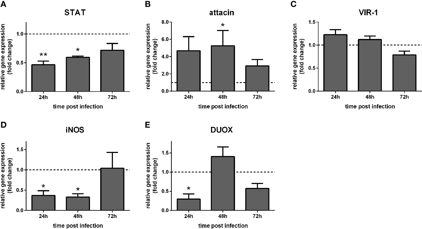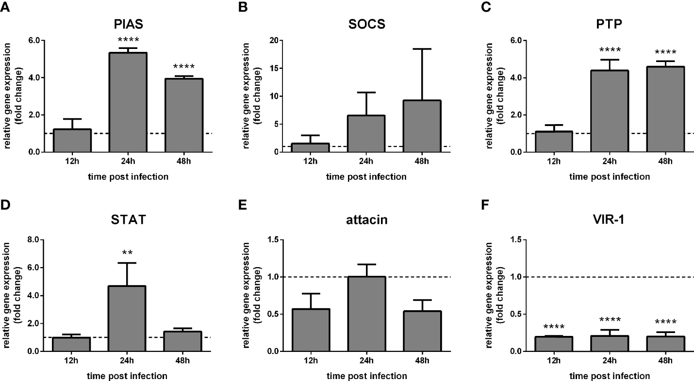 The putative PIAS and PTP61F expression significantly increased at 48 h and 72 h post-challenge compared to non-challenged control groups (Figures 2A, C), while SOCS expression showed a high variability (Figure 2B). The STAT-like transcription factor significantly increased at 24 h, while attacin showed no significant modulation (Figures 2D, E). Interestingly, VIR-1 was significantly reduced at 24 h, 48 h, and 72 h post-challenge (Figure 2F).