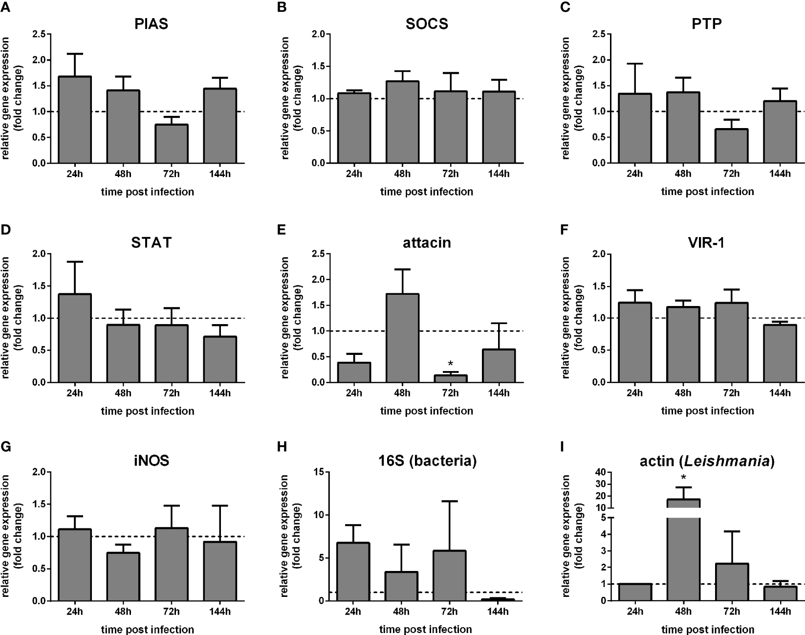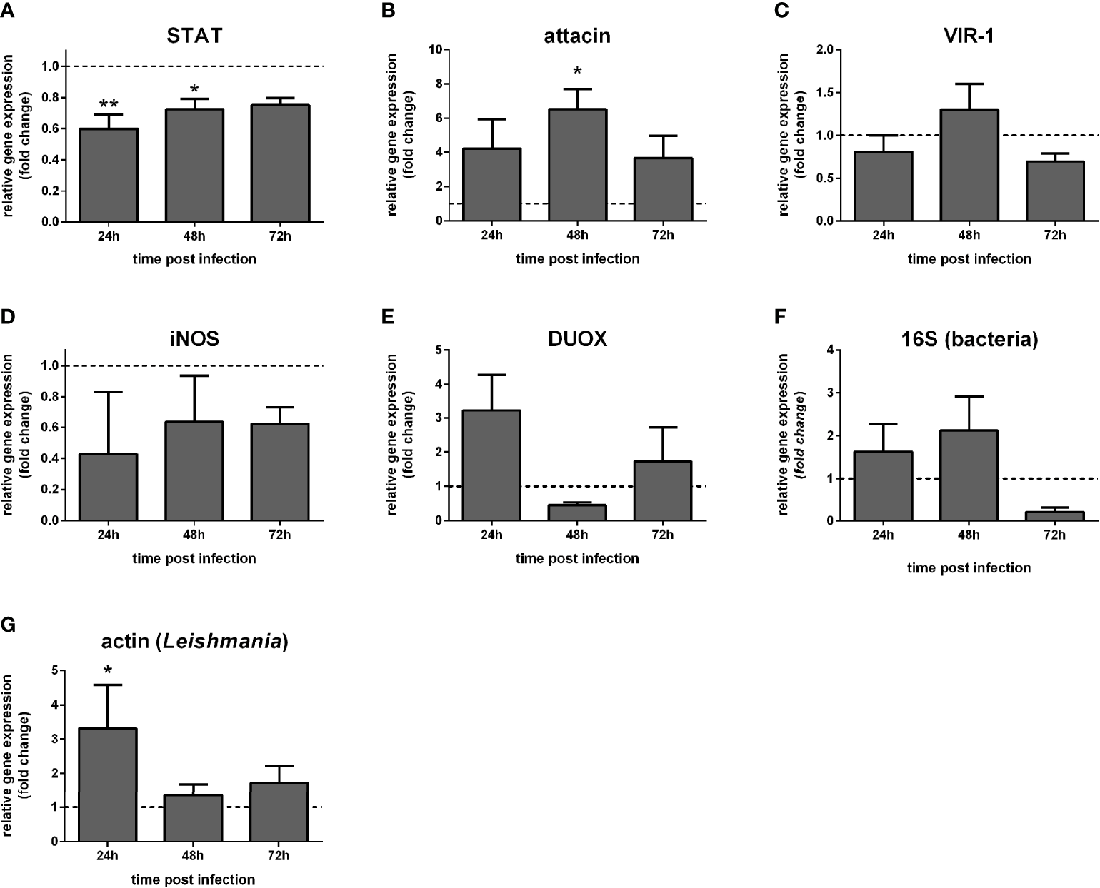 We used ordinary two-way ANOVA with Sidak’s correction for multiple comparisons test using GraphPad Prism software (version 6.07) (GraphPad Software Inc., USA) to test significant differences between experimental and control groups across various time points. The Sidak’s correction for multiple comparisons compute confidence intervals and significance based on adjusted P values. This method was applied to gene expression results obtained by qPCR and in infection estimation and localization results obtained by light microscopy observation.
