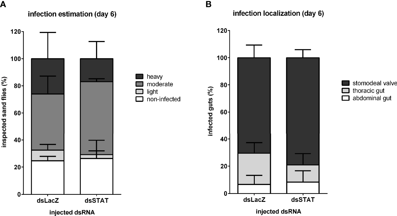 For the putative STAT gene silencing, STAT dsRNA was lyophilized and resuspended in nuclease-free H2O to 4.5 μg/μL final concentration. Females were microinjected intrathoracically with 32.2 nL of dsRNA using Nanoject II microinjector (Drummond, USA) (40). A non-related LacZ dsRNA was injected in negative control groups (41). For assays involving Leishmania infection, sand flies were artificially infected as described above on the following day after dsRNA microinjection and collected on subsequent days according to experimental design. For controlling gene silencing efficiency, injected flies were kept under colony conditions fed on sucrose and collected on three successive days post dsRNA microinjection.