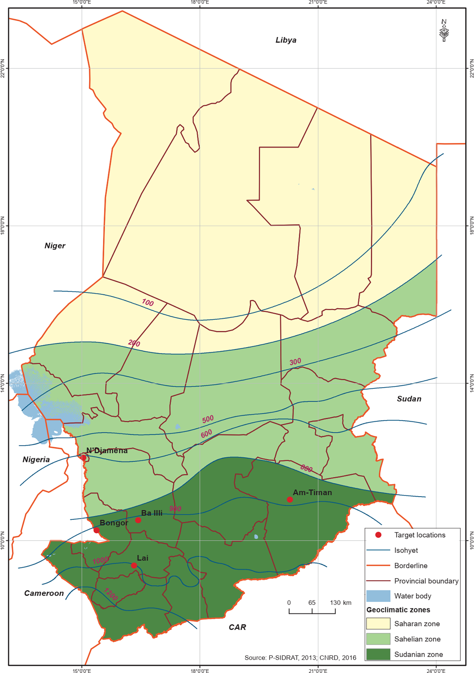 ▪ Laï (N 9°24’’ E 16°18’), the capital of Tandjilé Province is located in the Sudanian zone of the country. It is built on a flood plain with sandy-clay soil on the banks of the Tandjilé River, which isolates it from the country’s other towns each year during most of the rainy season. Rainfall (1,000 mm) is spread over six months (May to October), although it is more frequent in August than in other months. The average temperature is 26°C and the maximum of the hottest month is 40°C. Surrounded by large rice fields which represent the main activity of the population, other activities are fishing but also livestock concentrated on cattle, small ruminants and pigs;