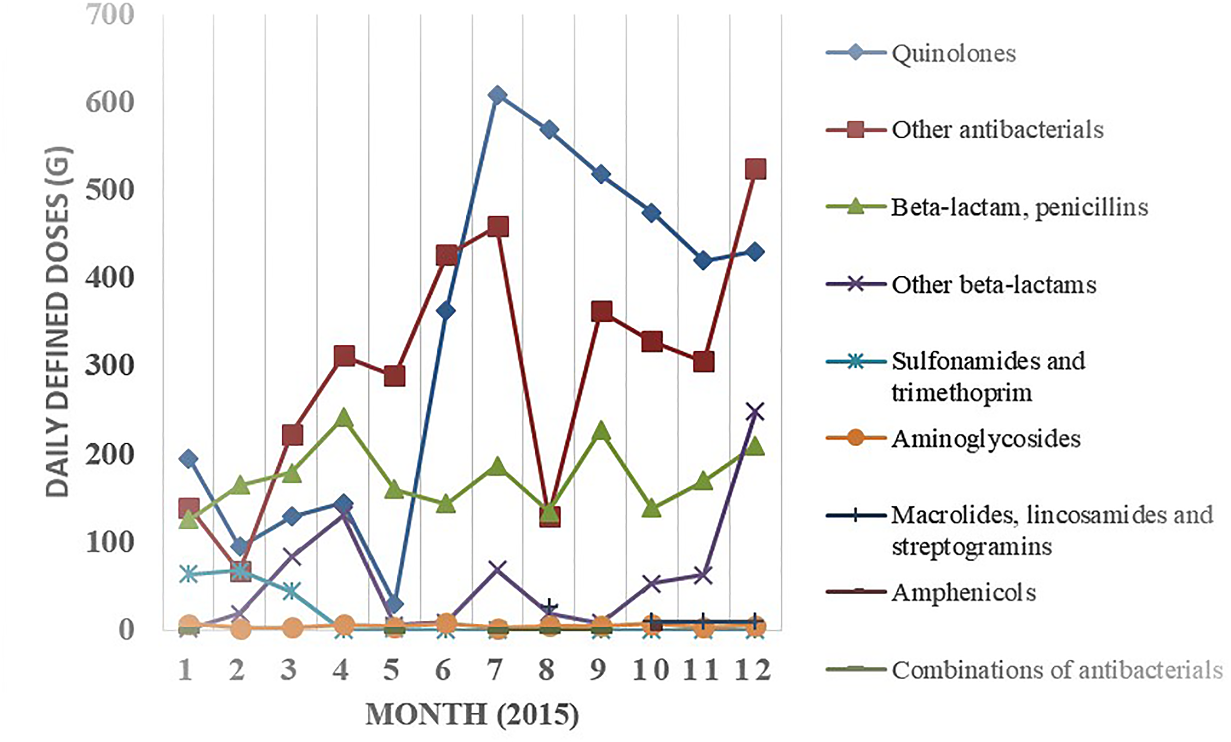 Monthly consumption variations per ATC level 3 classification of antibacterials at Muhimbili National Hospital, Tanzania, 2015. Monthly trends for these classes are shown in Supplementary Table 3.