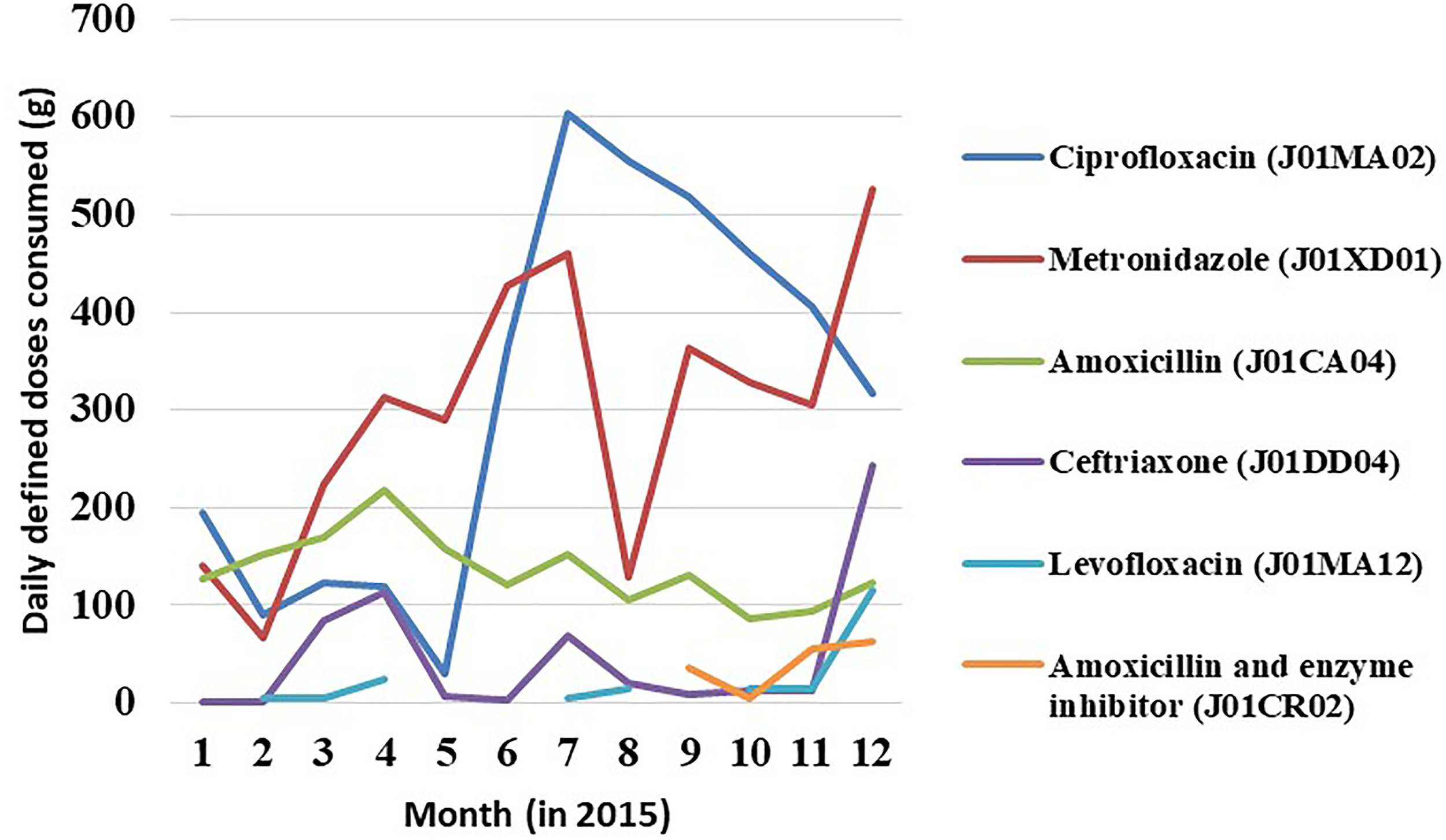 There was generally an increasing trend over the months per class of antibacterial at ATC levels 3 (Figure 2). There are peaks of utilized amounts in April, July and September of the study period. These increases are notable for individual antibacterials, including the top three antibacterials: ciprofloxacin, metronidazole, and amoxicillin (Figure 3).