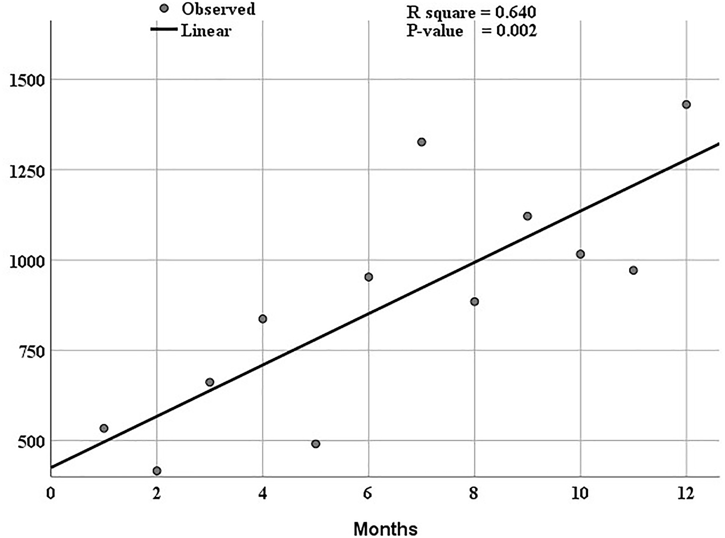 Linear regression curve estimate indicated a significant increase of antibacterials over the 12 months (p-value = 0.002 and R-square 0f 0.64 (Figure 4).