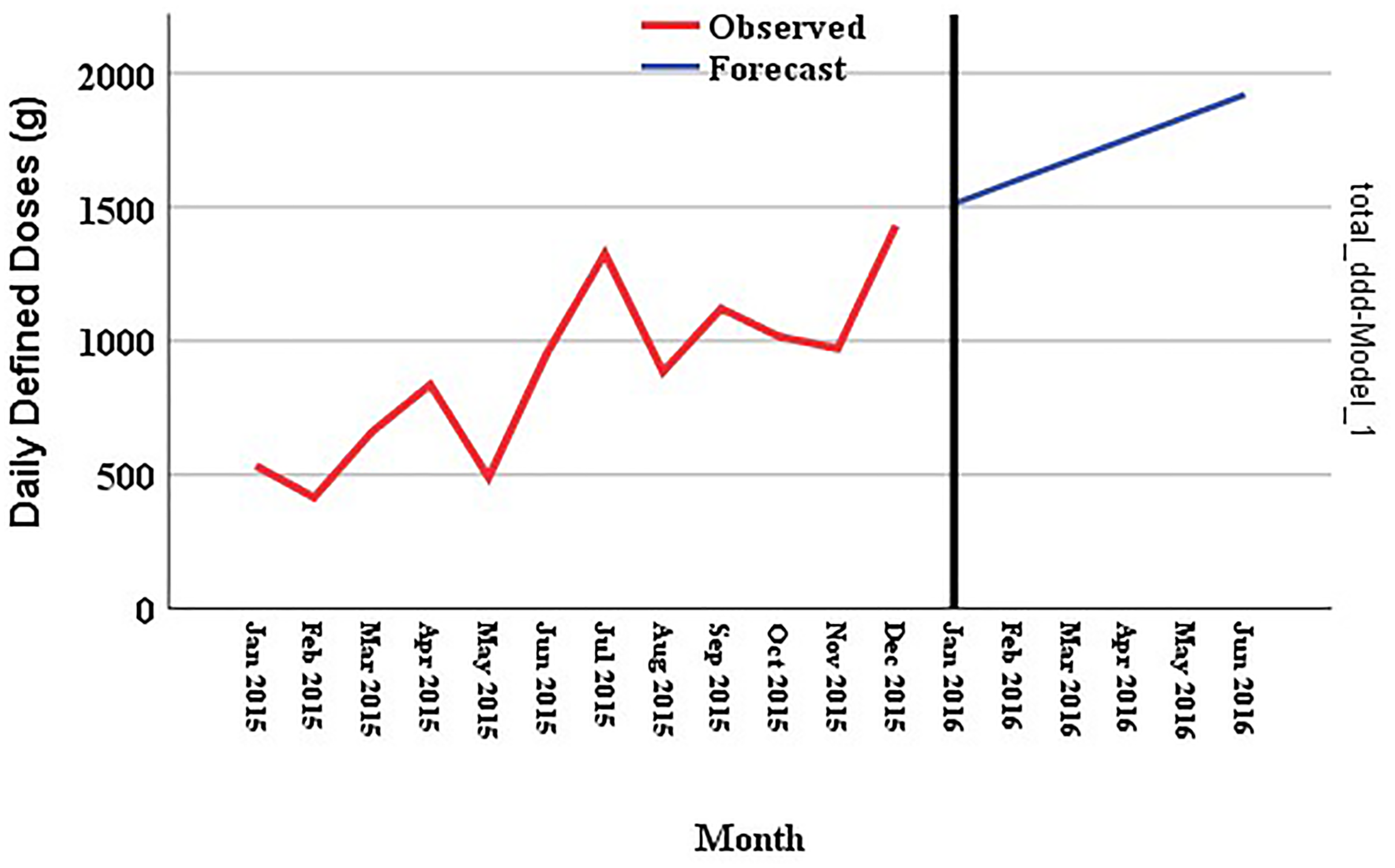 Trends of total utilized antibacterials over twelve months from January 2015 to December 2015. The autoregressive integrated moving average (ARIMA, 0, 1, 0) model forecasted the utilization to June 2016.