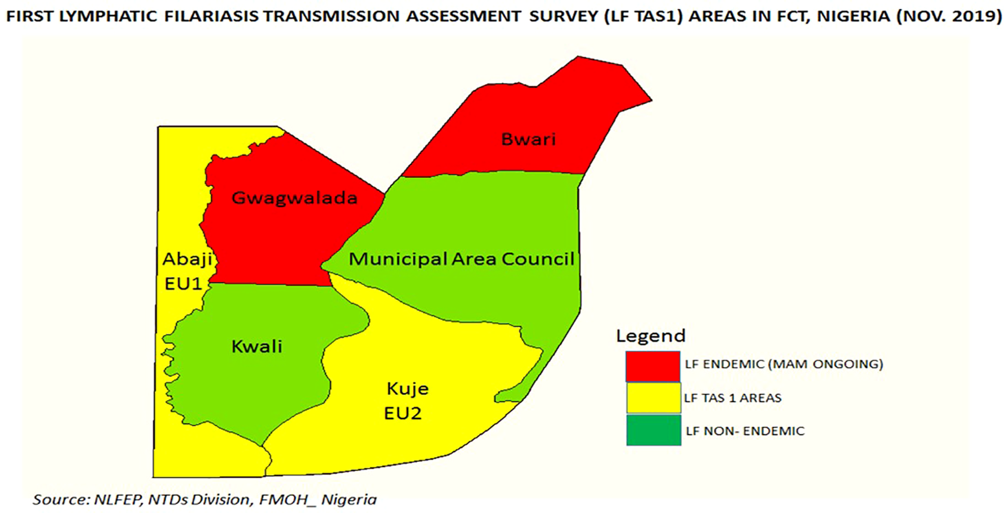 In Nigeria, the National Lymphatic Filariasis Elimination Programme (NLFEP) was established in 1997 in response to World Health Assembly (WHA) 50.29 resolution of May 1997 and was given a mandate to eliminate LF in Nigeria by 2020. Nigeria has the highest burden of lymphatic filariasis in Africa with an estimated 135 million people at risk of the disease (JRSM, 2019). Between 2008 and 2010, mapping of LF was carried out in the 6 Area Councils (ACs) of the Federal Capital Territory (FCT), using donated ImmunoChromatographic diagnostic test kits. Four of the six ACs (Abaji, Bwari, Gwagwalada and Kuje) were found to be endemic. MDA started in Gwagawalada AC in 2010 using donated medicines (3mg ivermectin and 400mg albendazole) and in 2011 was scaled-up to the remaining 3 endemic ACs. In 2018, a LF pre-transmission assessment survey (Pre-TAS) was conducted in Abaji and Kuje ACs (sentinel and spot check sites) because both ACs had achieved the recommended five effective treatment rounds (at least 65% therapeutic coverage and 100% geographic coverage). Both ACs passed pre-TAS and were therefore qualified for a first Transmission Assessment Survey (TAS 1).