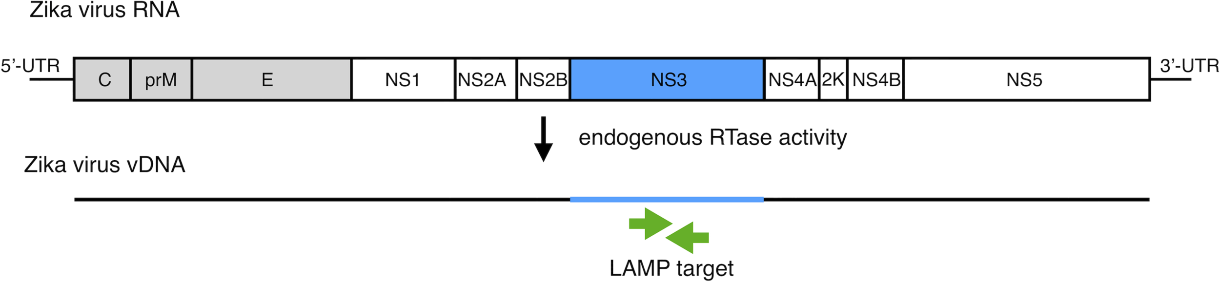 Schematic diagram of the ZIKV RNA genome with LAMP primer positions for amplifying vDNA, which is generated from ZIKV genomic RNA using endogenous RTase activity in mosquito cells. The vDNA region between a set of primers (green arrows) is the target for the LAMP reaction.