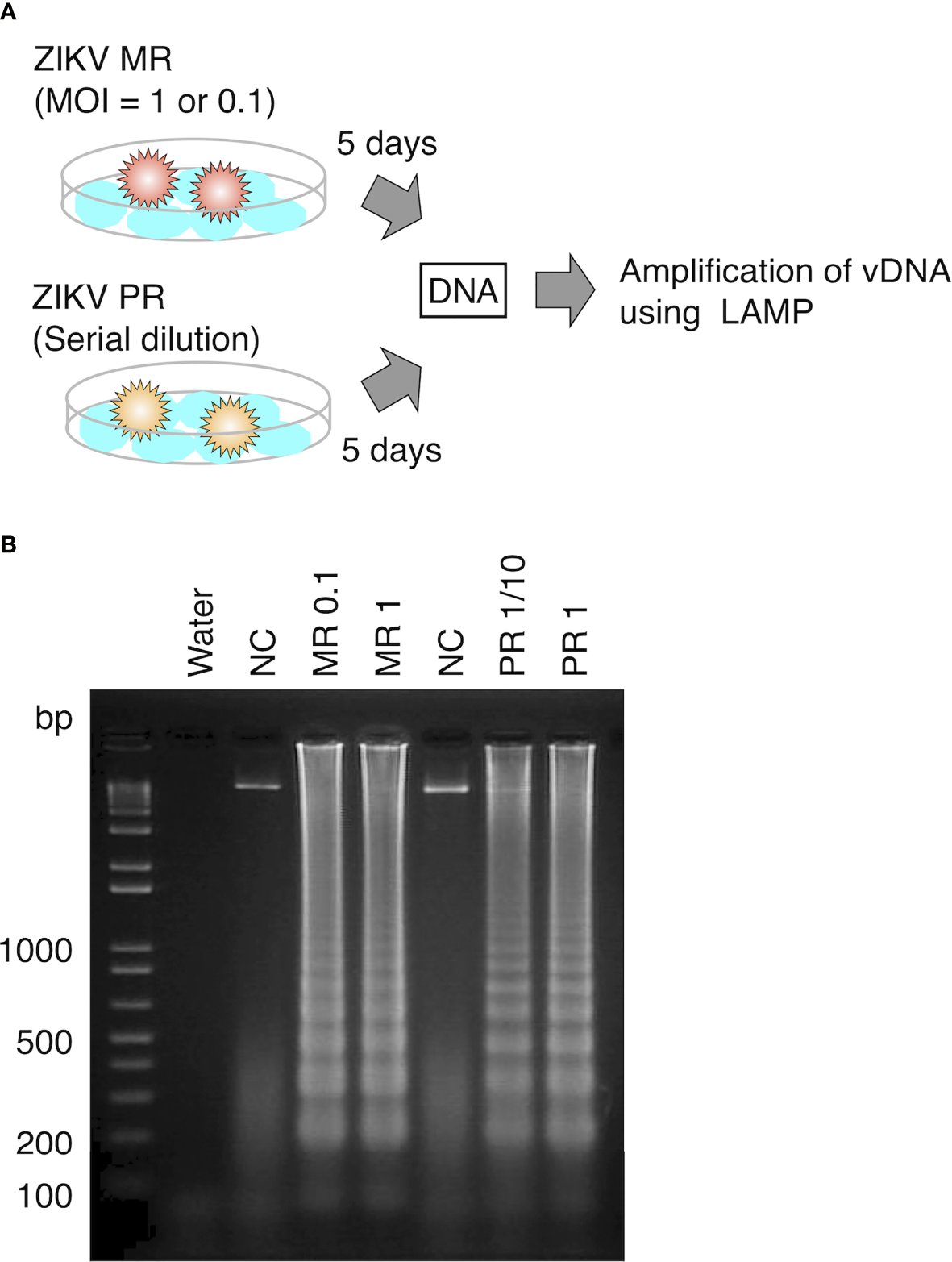 Detection of vDNA using LAMP in ZIKV-infected mosquito cells. (A) Scheme of preparing ZIKV-infected cultured cells for vDNA detection. DNA was purified from ZIKV-infected cells and uninfected cells at 5 days post infection and utilized for LAMP reaction. (B) vDNA was amplified using LAMP from mosquito C6/36 cells infected with ZIKV MR or PR strain. Amplified products were separated on 2% agarose gels. Water served as a negative control. MR: cells infected with MR strain at an MOI = 1 or 0.1. PR: cells infected with PR strain (PR 1, infection without dilution of virus stock; PR 1/10, 10-fold dilution of virus stock). NC, negative control (uninfected cells).