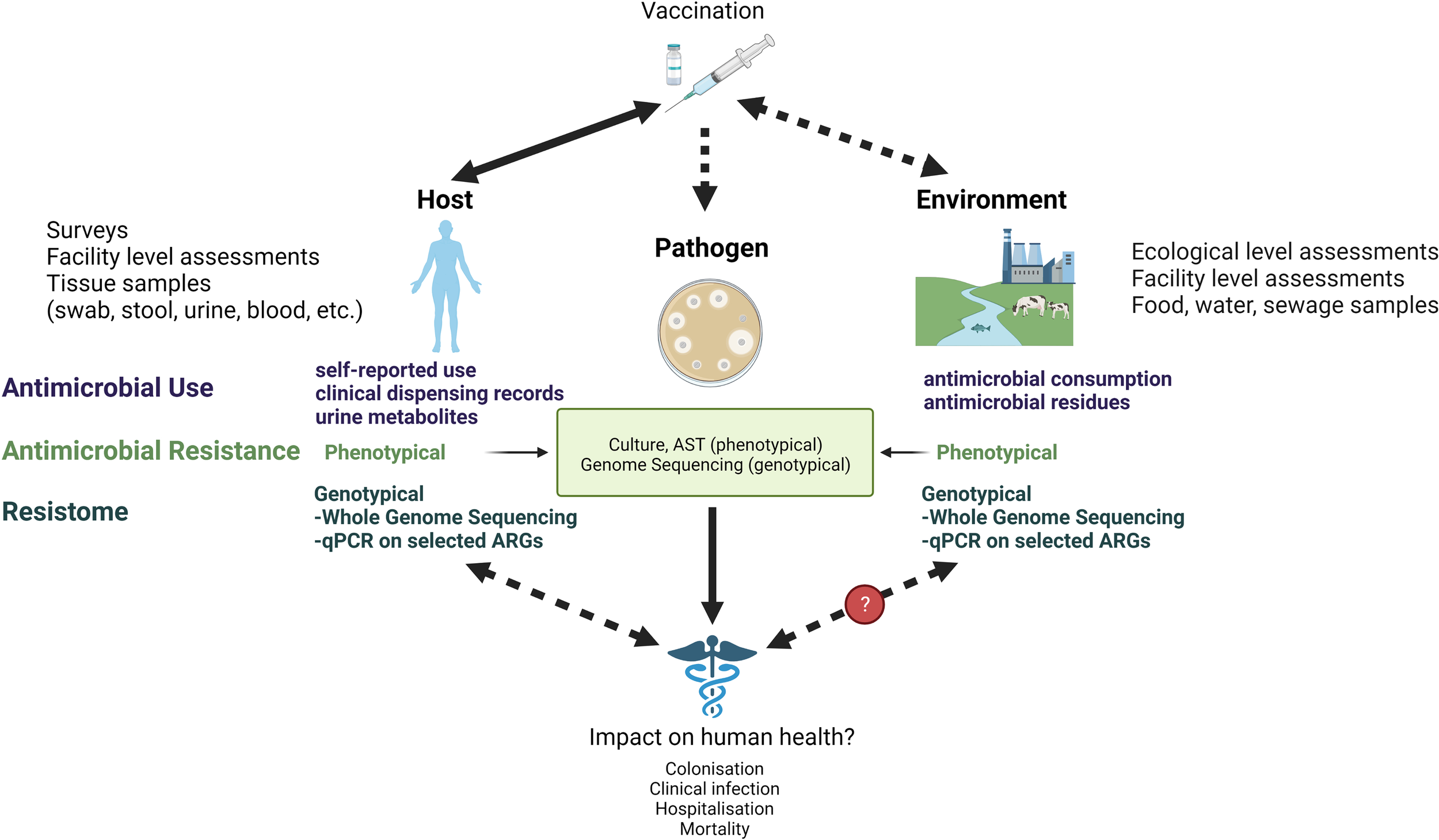 Measuring the link between vaccines and AMR at the host, pathogen, and environmental level. AST, Antimicrobial Susceptibility Testing; qPCR, quantitative polymerase chain reaction; ARG, Antimicrobial Resistance Genes.