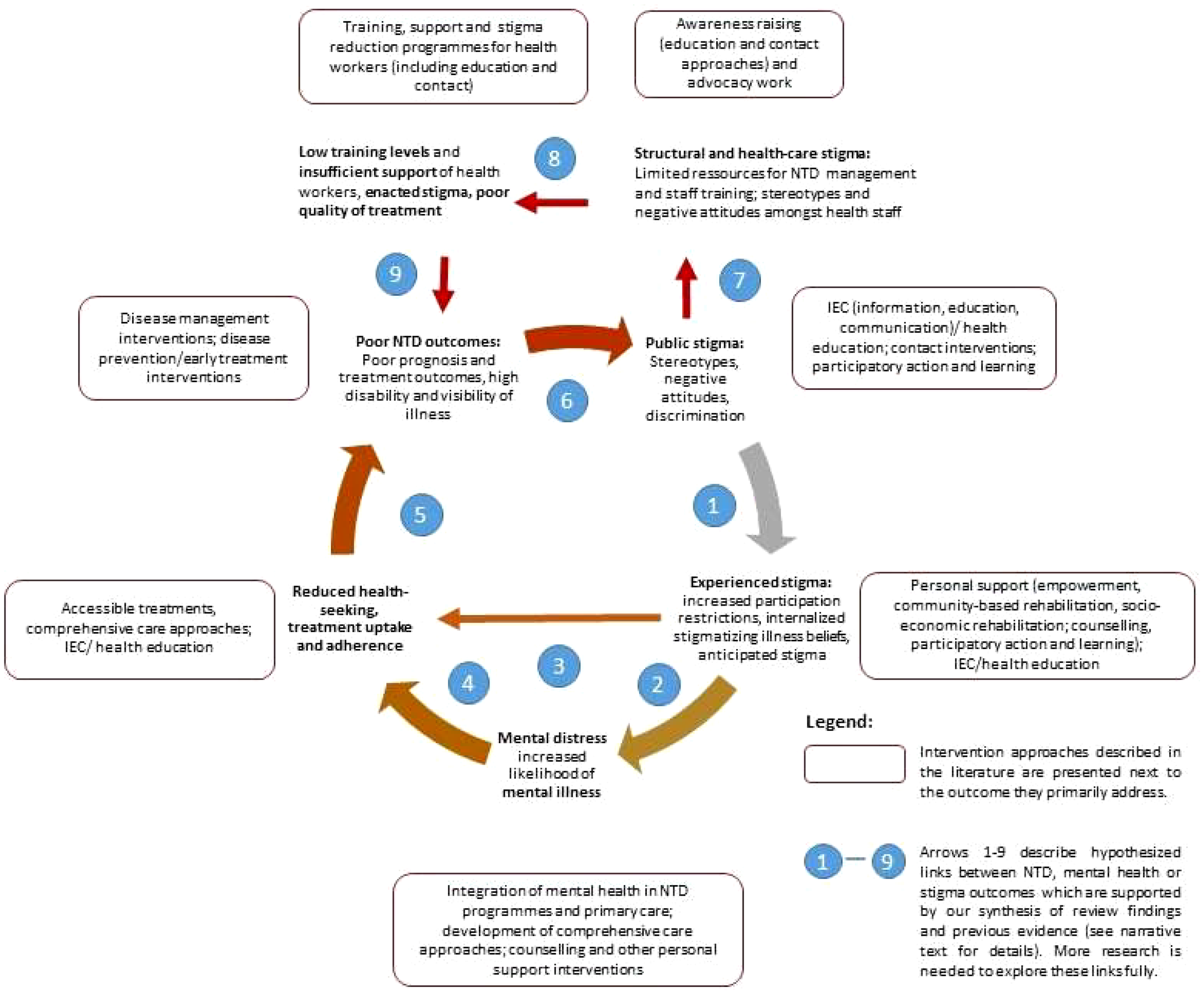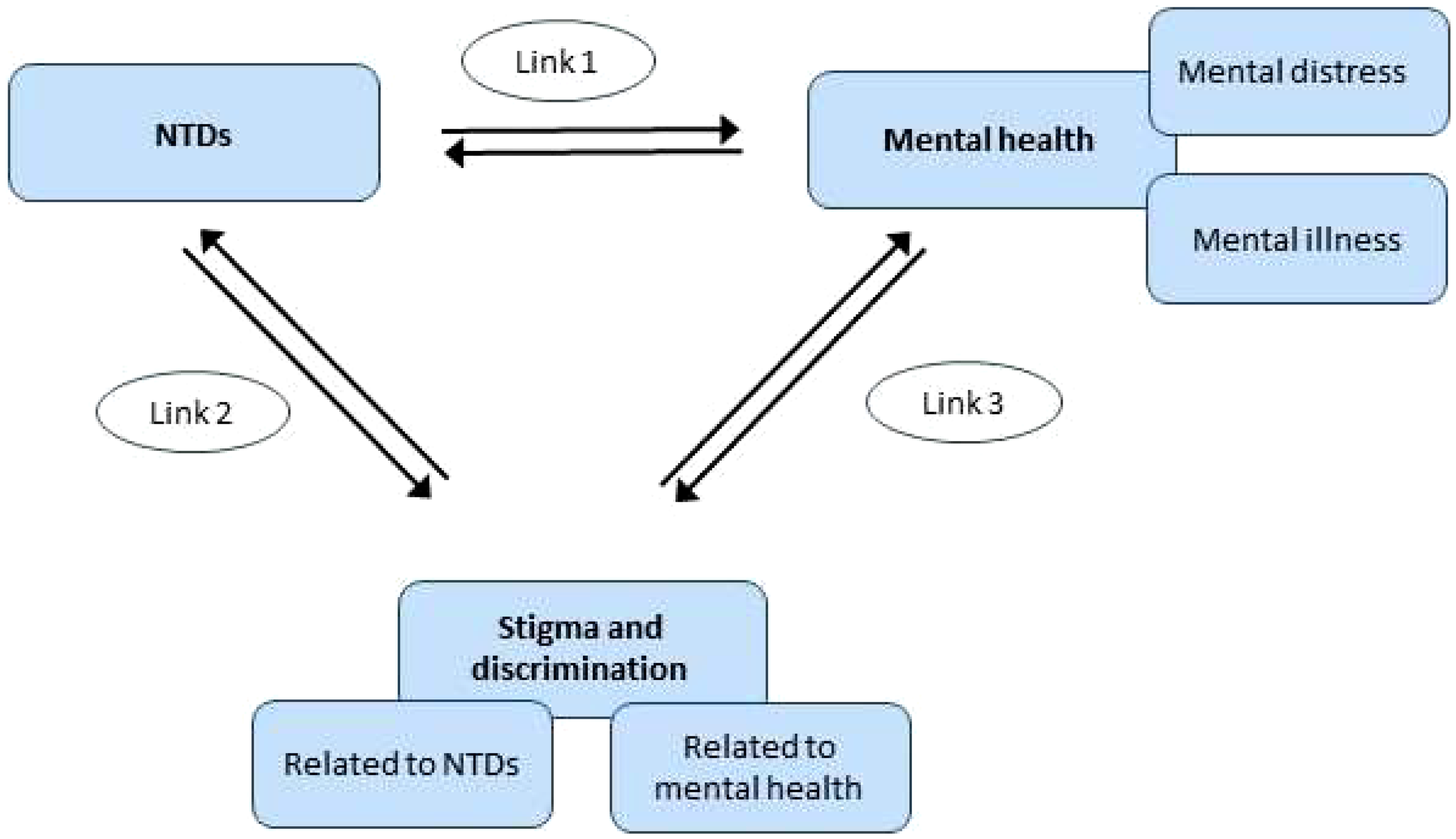 In this paper, we review and summarize the existing evidence on the links between NTDs, stigma, and mental health and derive recommendations for research and lessons for effective interventions to address mental health and stigma-related problems in NTD programmes and community interventions. The nature of these intersecting domains is that there are often mutually reinforcing, complex interactions between multiple social and personal factors. In order to address this, we propose a conceptual framework that clarifies relationships between different elements that we wish to explore, which we hope will also be helpful to guide research and action at several levels and by a range of stakeholders (Figure 1). This review itself also enables an examination of the utility of the conceptual frame in understanding these areas.