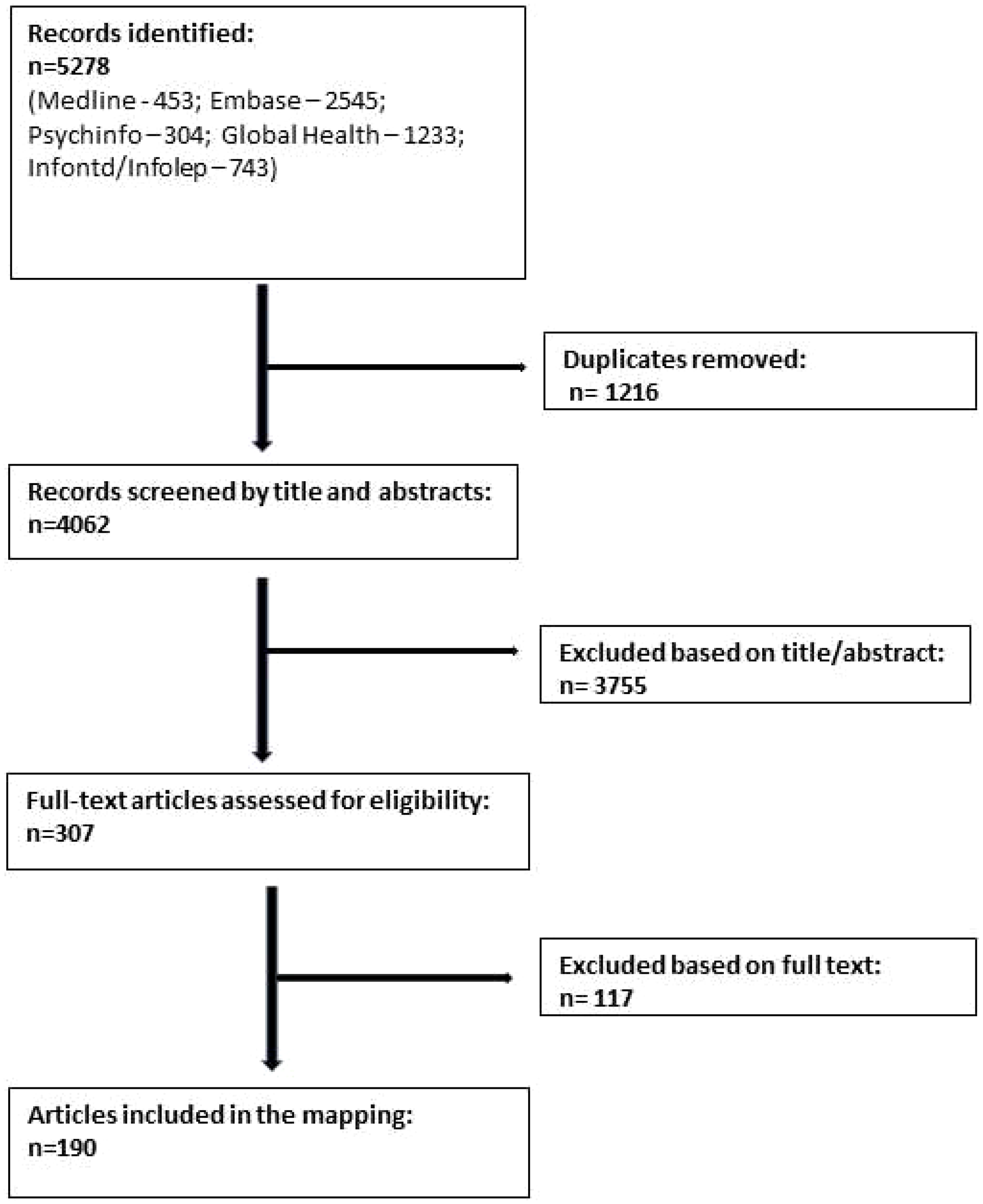 A total of 190 articles were selected for inclusion (see also Figure 2). Data were extracted (by EA, MK, MS, PCH, and YAH) using categories derived from the research questions of the study, for example, “Burden and frequency of mental distress and illness amongst people affected by NTDs”. The first set of 25 studies was coded by two reviewers independently and then discussed in the group until agreement on the level of detail and type of information to be extracted had been achieved. Data were then extracted from the remaining papers separately. Coded data were summarized to identify key cross-cutting findings as well as important differences between diseases and countries for each research question.