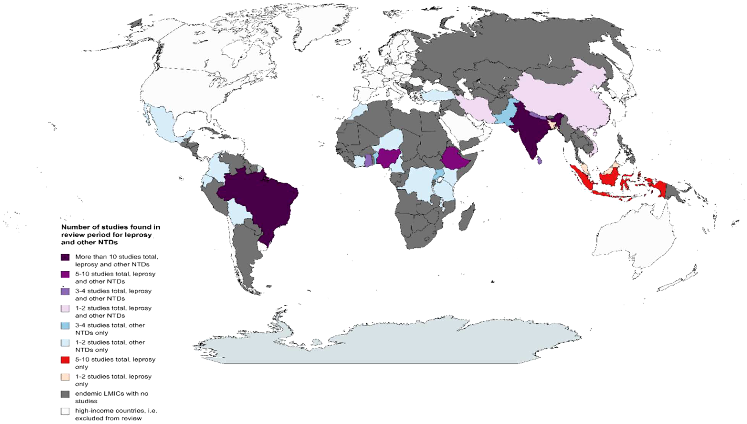 Figure 3 shows those LMICs where we found published studies on the link between NTDs and mental health for both leprosy and other NTDs during the review period. There were over 100 LMICs that are endemic for at least one NTD, for which we did not find any relevant study during the review period.