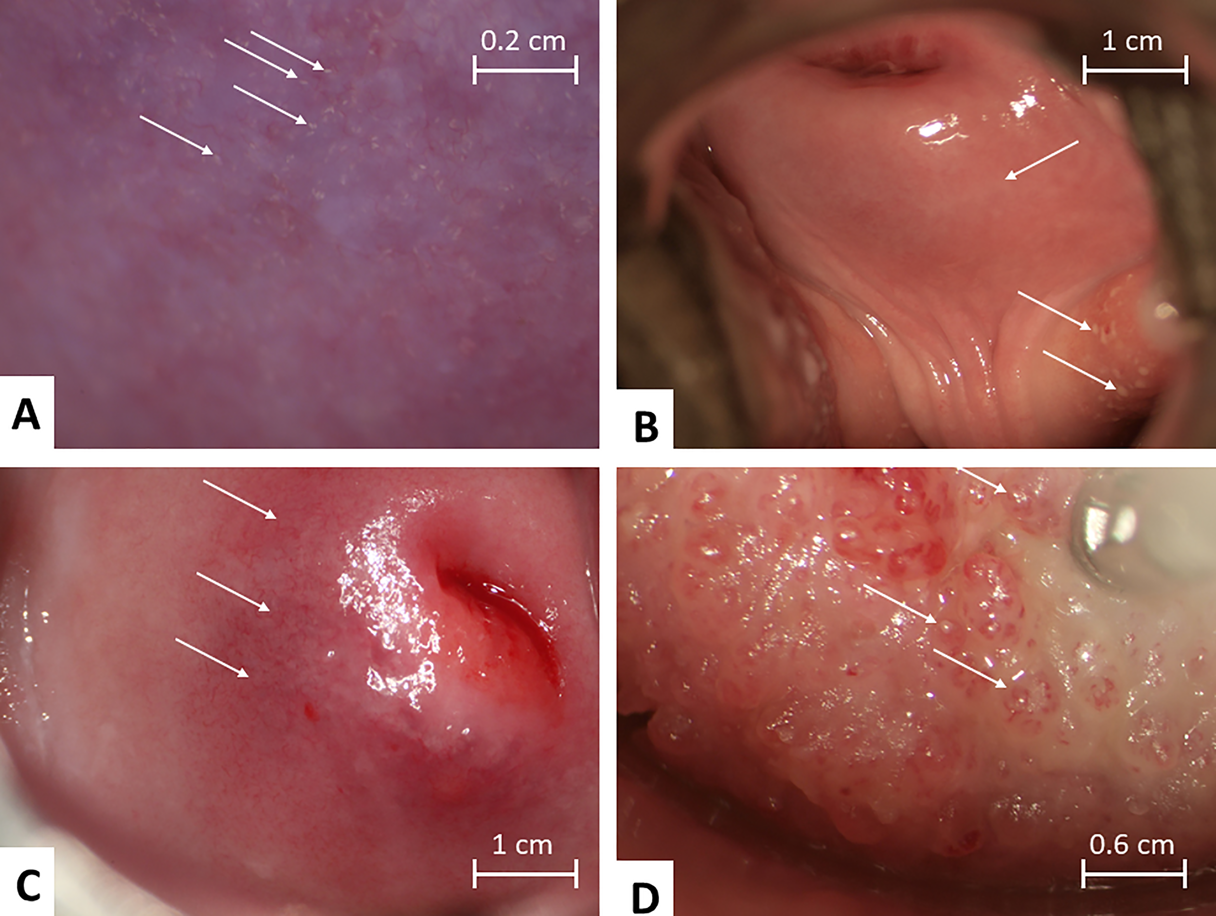 Mucosal colposcopic findings of clinical manifestations of Female Genital Schistosomiasis. (A) Grainy sandy patches appearing as single grains and clusters of grains. (B) Rubbery papules in both fornices (left and right), abnormal blood vessels (circular) are seen on cervix 6 -7 o’clock. (C) Homogenous sandy patch on the cervix (clearly seen on left side of image), abnormal blood vessels are seen especially clearly 7 - 10 o’clock outside the transformation zone, mottled yellowish areas can be seen in the background. (D) Rubber papules on cervix found in a 22 year old women in Madagascar. Photos by: Elisabeth Kleppa, Bodo Raniandrasolo and Eyrun Kjetland.