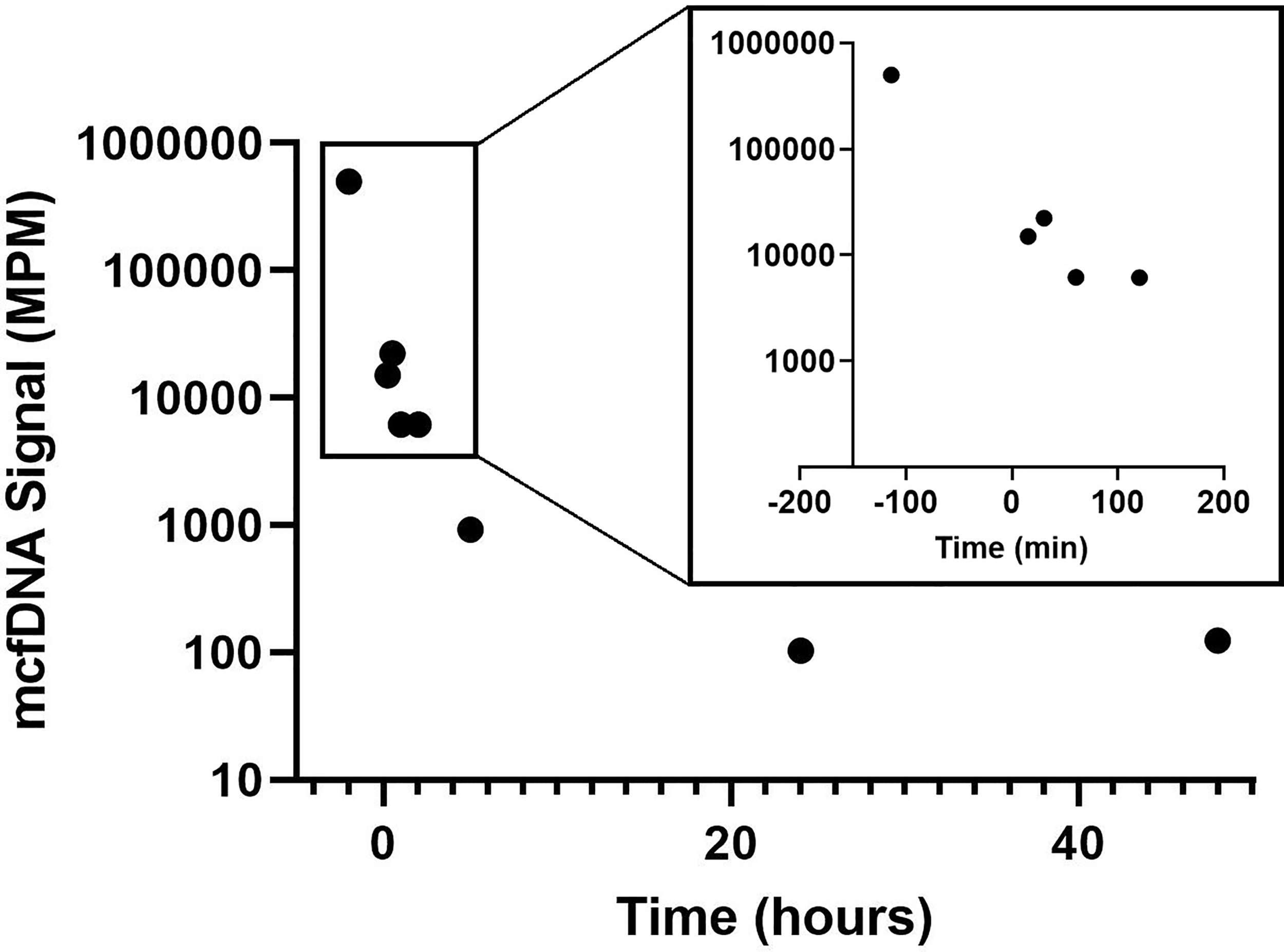 It is difficult to know when a valve has been sterilized in cases of culture-negative endocarditis, and, as seen with certain malignancies, serial measurements of tumor cfDNA offer a potential, objective measure of response to therapy (either surgical or medical) (12–14). However, in the setting of infection, correctly interpreting changes in microbial cfDNA first requires an understanding of its rate of decay. While the half-life of cell-free DNA from human-derived tissues has been established (15–22), there have been no definitive assessments of the rate of decay of microbial cfDNA in plasma. Monitoring the changes of mcfDNA after the debridement of a discrete, high-burden, focal infection would afford the opportunity to measure mcfDNA decay.