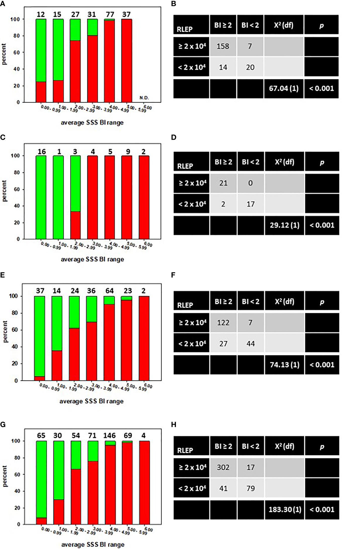 An average SSS BI ≥ 2 is associated with recovery of sufficient M. leprae from a skin biopsy to run the MVA. The distribution of the average SSS BI versus the percentage of MVA biopsies from which ≥ 2 x 104M. leprae (red bars) or < 2 x 104M. leprae (green bars) were recovered in specimens from CSC-Philippines (A), AHRI-Ethiopia (C), AH-Nepal (E), or a Composite of all specimens combined (G). N.D. = none determined. Numbers above the bars indicate the number of cases per average SSS BI group. Chi-square tests of independence showed a significant association between an average SSS BI ≥ 2 and recovery of sufficient M. leprae for MVA in CSC-Philippines (B), AHRI-Ethiopia (D), AH-Nepal (F), or a Composite of all specimens combined (H).