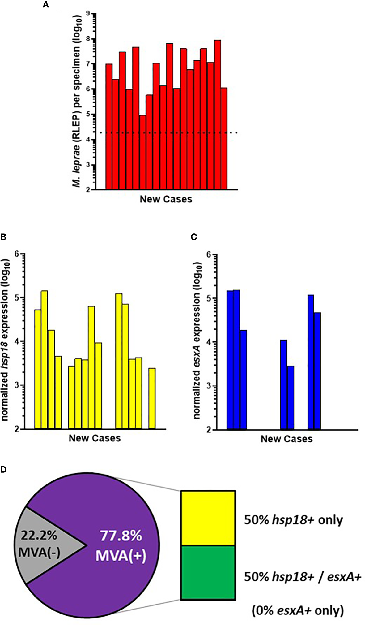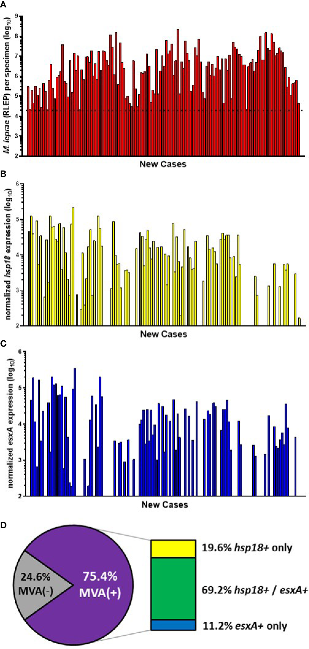 Of the 199 specimens from the CSC-Philippines, 148 samples satisfied the M. leprae number (≥ 2 x 104) and RNA extraction criteria. Of these, 142 were new cases (Figure 2A). These new cases were evaluated for M. leprae viability via the MVA using both hsp18 and esxA transcripts as targets. 66.9% (95/142) of the new cases expressed hsp18 (Figure 2B) while 59.9% (85/142) expressed esxA (Figure 2C). Overall, viable M. leprae (MVA[+], expression of one or both transcripts) were detected in 75.4% (107/142) of the new cases (Figure 2D). Expression of both transcripts was detected in 69.2% (74/107), while only hsp18 was detected in 19.6% (21/107) cases and only esxA was detected in 11.2% (12/107) cases.