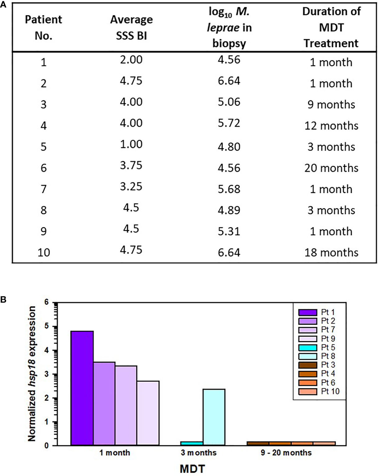 M. leprae enumeration and viability in patients from AH-Nepal currently on leprosy MDT. (A) The table depicts the average SSS BI, number of M. leprae (log10) in the biopsy specimen used for MVA, and the duration of leprosy MDT. (B) The graph shows the normalized hsp18 expression in patients treated with MDT for 1 month (purple bars), 3 months (blue bars), and > 9 months (brown bars).