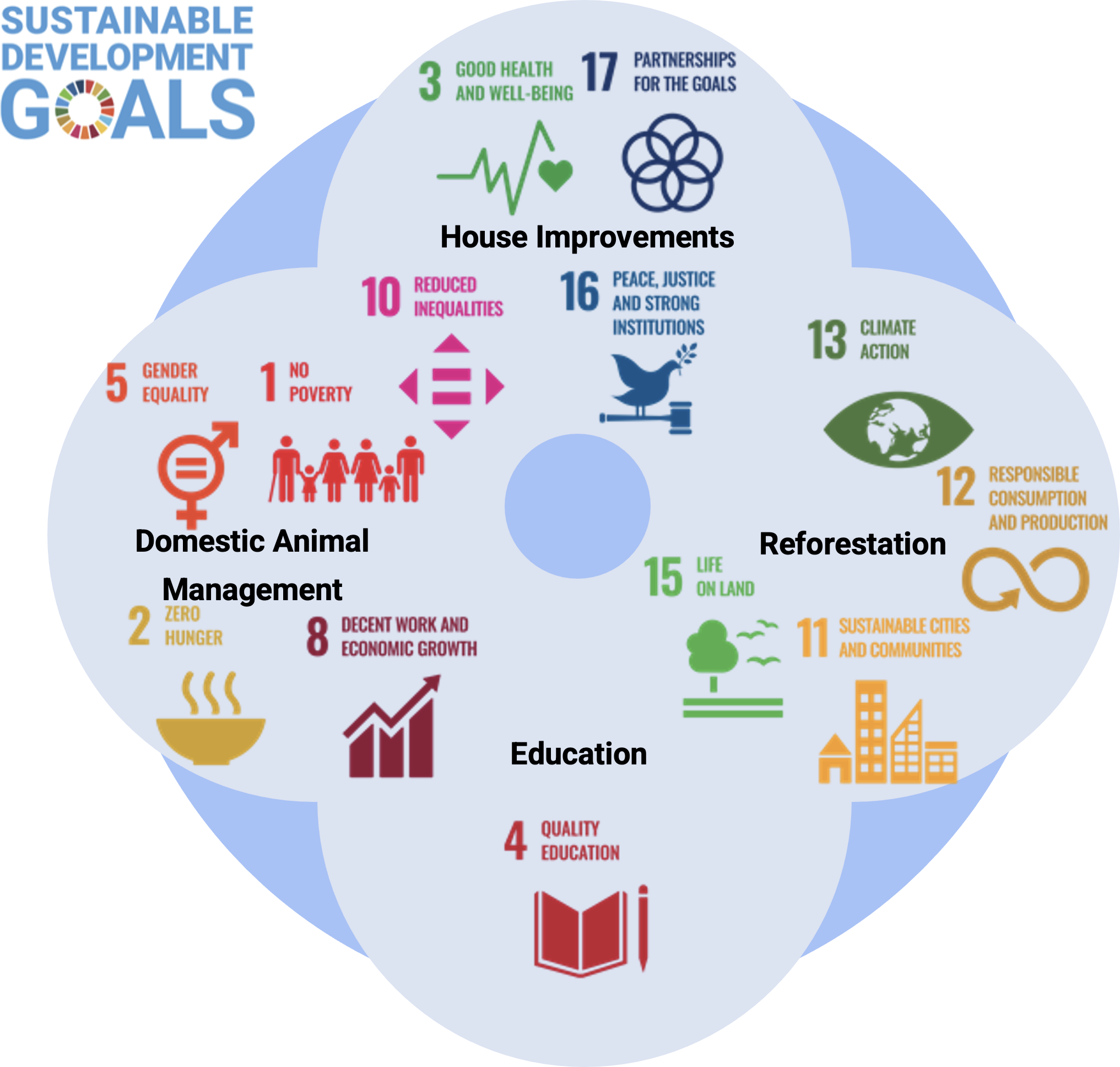 The results of these community surveys on environmental and social risk factors of infestation provided key information reinforcing the need for an integrated Ecohealth approach. The most important SDGs at this stage were the realization that good health and wellbeing required reduction in poverty and inequalities (Goals 3, 1 and 10).