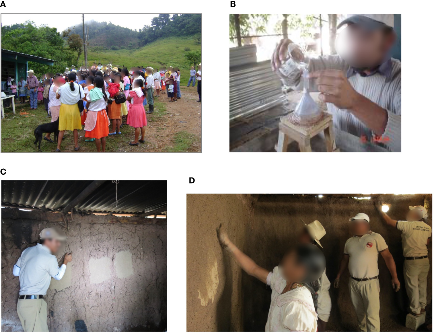 For our initial development of the integrated Ecohealth intervention, our transdisciplinary team engaged two highly endemic communities in southern Guatemala (La Brea and El Tule, Quesada, Jutiapa). These villages, despite regular insecticide spraying by the Ministry of Health, showed substantial reinfestation (38). Led by a medical entomologist we shared the data of household risk factors with the community (Figure 3A) and following an initial insecticide spray to knock down the numbers of vectors inside the houses, we jointly selected four interventions to maximally reduce T. dimidiata s.l. infestation and support development. These four interventions included (1): wall plastering to remove the cracks and crevices and make the houses refractory to the insect vectors, (2) cementing the floors to remove habitat for egg laying, and (3) building chicken coops and moving the chickens outside and away from the house thus removing a food source that amplifies the vector populations while simultaneously increasing nutrition and promoting economic development, and (4) reforestation with native trees to replace vector habitat and support economic development. In the first two years, with the help of anthropologists and sociologists, we studied community practices and gender roles to ensure that interventions were culturally appropriate and sustainable (30, 59, 60). We learned that wall plastering was the most common house improvement undertaken; traditionally, women, using their hands, plaster the walls to beautify the house (30). Customarily just mud was used, which rapidly cracks, recreating triatomine hiding places. To improve the plaster, community residents supplied locally - sourced materials, including sand, dirt, and volcanic ash. Architects and engineers evaluated the materials and designed a new formulation more resistant to cracking (Figure 3B), which is adapted to each village by first testing the adherence of plasters made with different ratios of sand to dirt. They also formulated a “cement-like” floor using volcanic ash and lime at approximately 1/10th the cost of commercial cement. Where river sand was far from the village, the Municipality assisted with transportation of the materials. We worked alongside the Vector Control Program personnel of the Ministry of Health while they conducted the entomological surveys and applied insecticide. Once optimized, instruction was provided to the larger community by two young men that we hired from the village (one shown instructing, Figure 3C), enabling community residents to make the improvements to their own houses (Figure 3D). The process was sequenced so once the walls were plastered, supplies were provided to complete the cement-like floors, then chicken wire was provided, and the householders constructed chicken coops and moved their chickens outside the house (Figure 4). Later fruit tree seedlings were provided, and a plant nursery established in the village. Throughout the process we included education on Chagas disease transmission and house and yard hygiene and provided training to the community residents and Ministry of Health personnel.