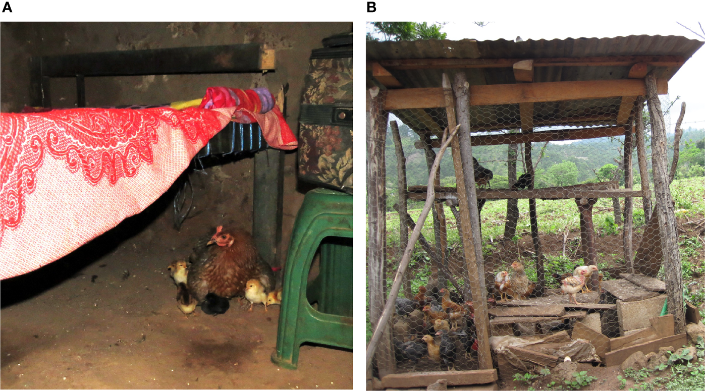 Chickens are traditionally kept near the bed for their protection (A), which amplifies the vector population and increases human-vector contact. As part of the Ecohealth intervention, chicken wire was supplied to community residents who constructed outdoor chicken coops (B) removing the vector blood source from the houses and increasing chicken production.