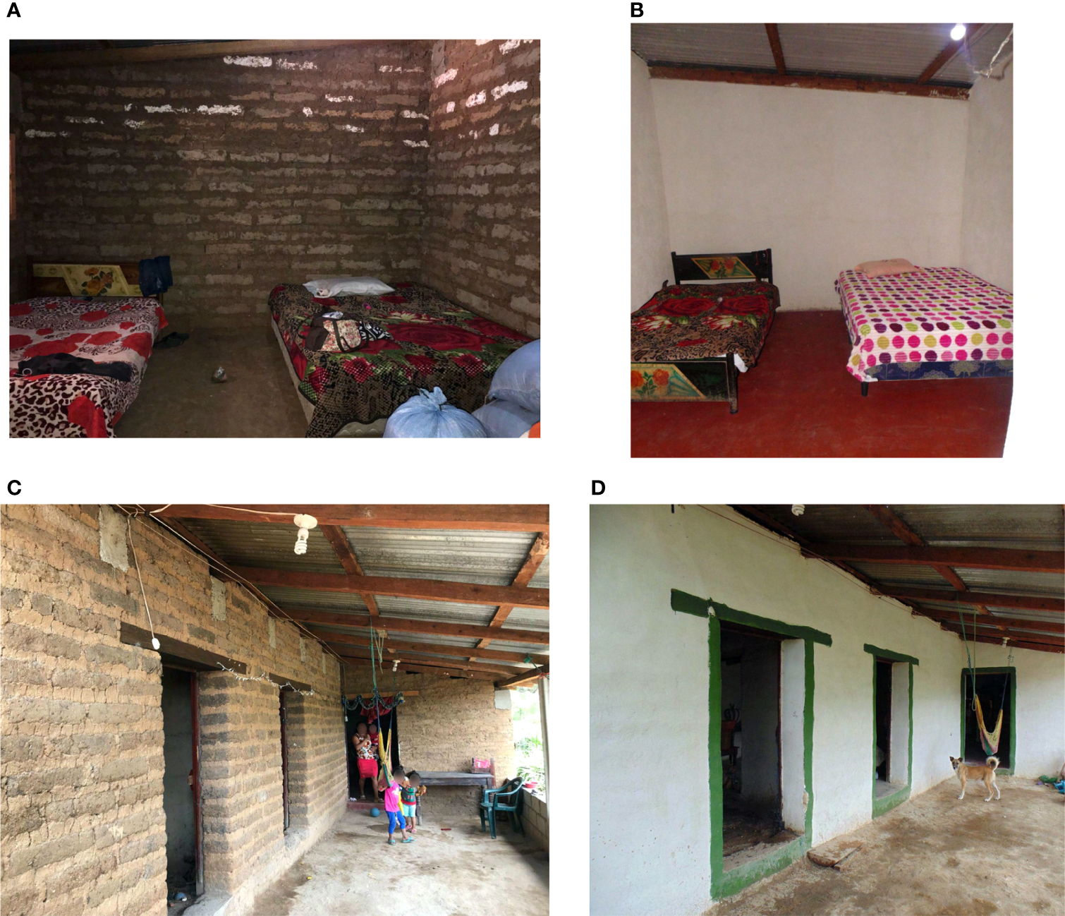 The same house before (A, C) and after (B, D) Ecohealth improvements inside and outside, respectively. Once the houses are improved the finished walls and floors and brighter interior encourages residents to keep it clean, which removes bug refugia and further reduces infestation.