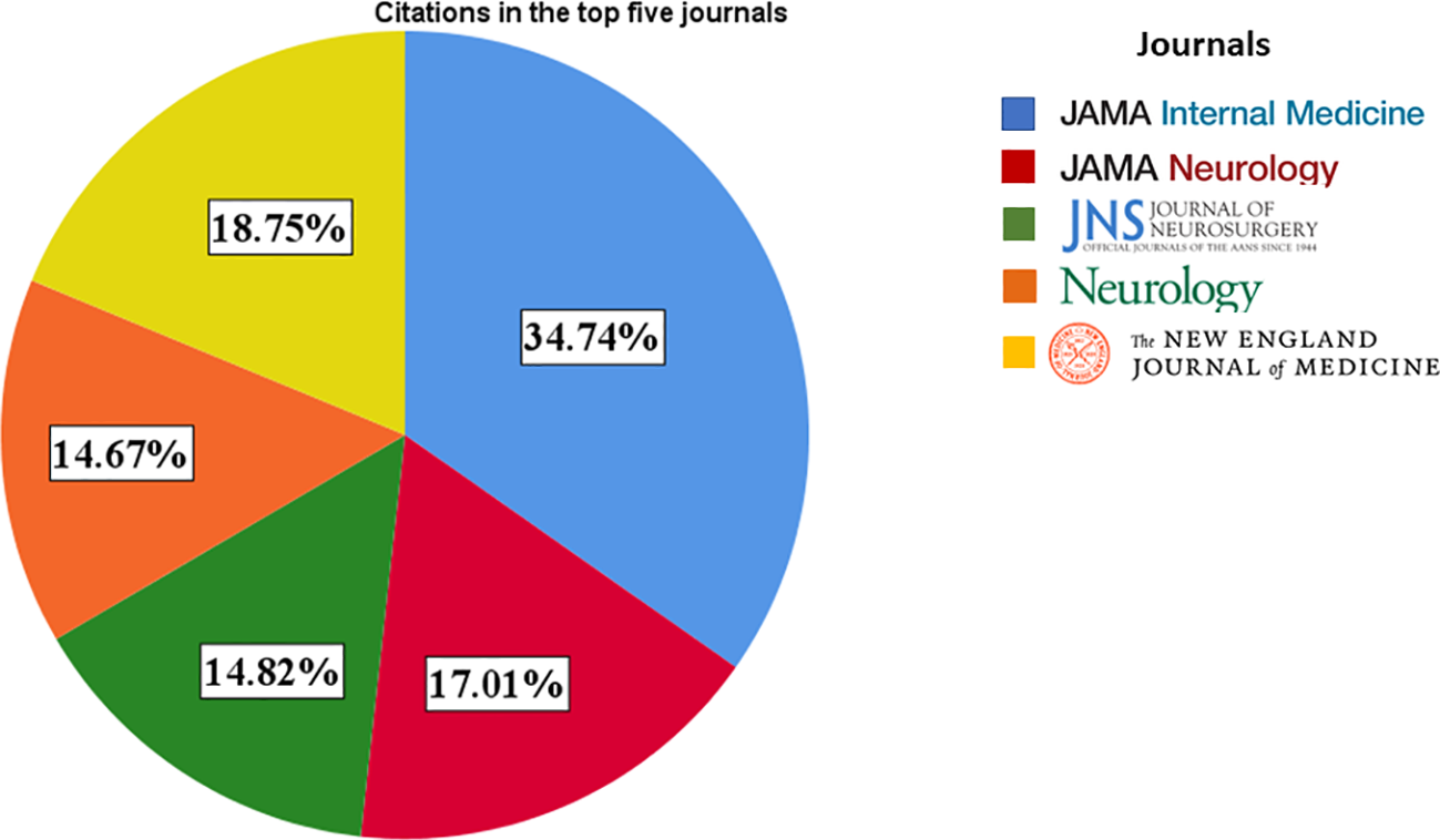 Number of citations by Journals. The most prolific five Journals. Archives of Internal Medicine with a total of 797 citations, followed by Archives of Neurology with 575 cites, New England Journal of Medicine with a total of 497 cites, Journal of Neurosurgery with 388 cites, and Neurology with 365 cites.