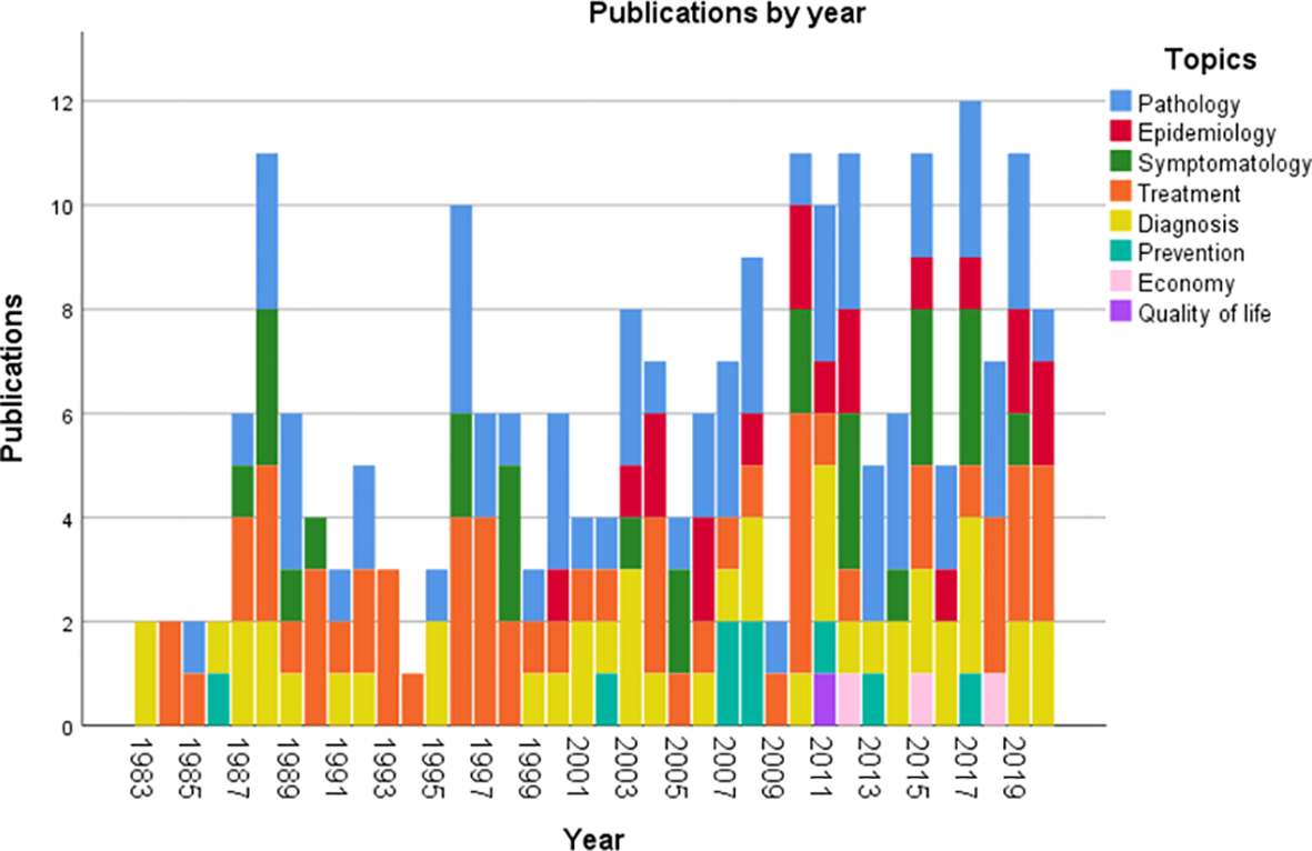 The main objective of a bibliometric analysis on this neglected tropical disease is to describe the situation of research on NCC from a highly active institution. By describing the areas of interest and the uncharted zones and their evolution, we can highlight the topics where our efforts have to be focused, because they are neglected areas of opportunity. By examining the major themes and historical trends, we can bring out the topics having stood the test of time, whether others can experience peaks and valleys (30). In further studies, we can analyze the patterns of cooperation and elucidate how Latin American research can find partners with interests in the same field (22–26).