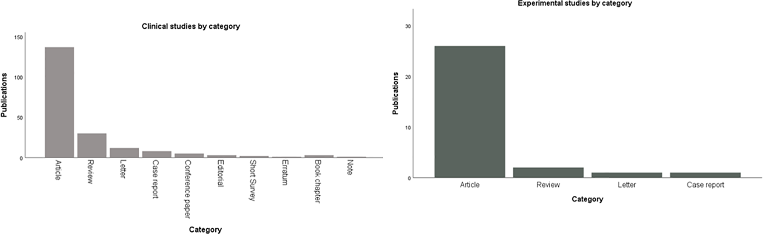 Number of papers from the clinical or experimental area per document type. Original articles are the largest group.