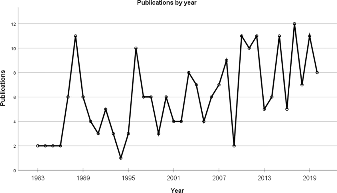 Of the 232 papers, 87% were clinical (202) and 13% were experimental (30). Clinical papers have dominated the scene across all the periods of study. In terms of citations, the top journal was Archives of Internal Medicine (797 citations), followed by Archives of Neurology (575), New England Journal of Medicine (497), Journal of Neurosurgery (388), and Neurology (365) (Figure 3). The trending topics per year were pathology, epidemiology, symptomatology, treatment, diagnosis, prevention, economy and quality of life pharmacology, pathology, medical treatment, epilepsy, epidemiology, immunodiagnosis, diagnosis, immunology, neurovascular, and hydrocephalus as illustrated in Figure 4. By category, the clinical articles were divided as follows: 137 were classified as original research, 30 as reviews, 12 as letters to the editor, eight as case reports, five as conference papers, three as book chapters, three as editorial, two as short surveys, one as note, and one as erratum. On the other hand, experimental research had 26 original, two reviews, one case report, and one letter to the editor (Figure 5). Furthermore, national journals, number of articles, and their citations per article are shown in Table 2. The most prolific first or corresponding authors by category are observed in Table 3. Furthermore, clinical studies by type of design are shown in Table 4, and experimental studies are observed in Table 5. The number of publications made by year is seen in Figure 6.