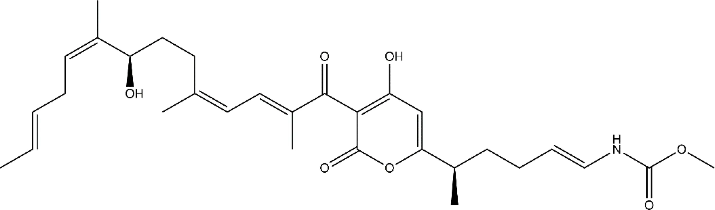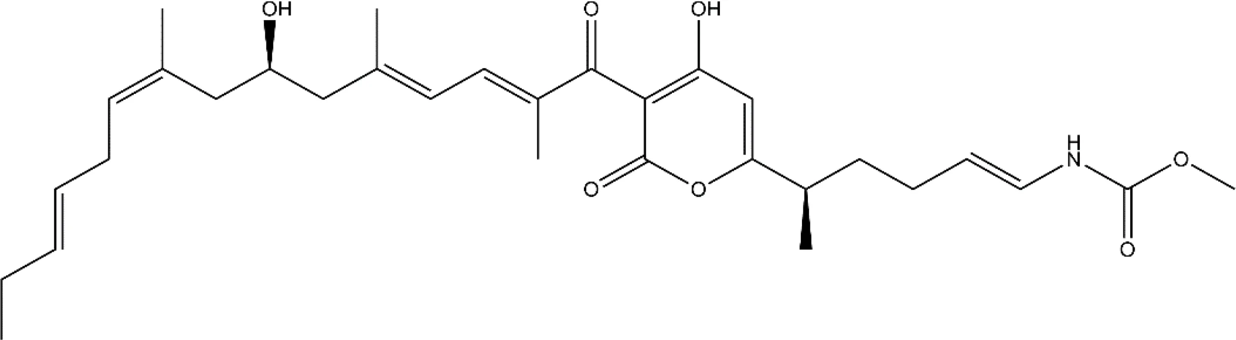 Corallopyronin A (CorA) is a myxobacterial α-pyrone antibiotic which includes two side chains (Table 1). The eastern chain is structurally defined by a vinyl carbamate structure. The vinylogous carboxylic acid structure of the western chain leads to the acidic behavior of CorA (pKa: 3.7). However, long alkyl chains with several double bonds beginning from the pyrone ring cause the lipophilic character of CorA (logP: 5.4) (36, 37). It is an antibiotic naturally produced by the soil myxobacterium Corallococcus coralloides and inhibits the bacterial DNA-dependent RNA polymerase (RNAP) (38, 39). CorA is highly effective against Gram-positive bacteria, while it shows only low efficacy against Gram-negative bacteria (38, 40, 41). In contrast to rifampicin, which also inhibits the RNAP, CorA inhibits the RNAP at the switch region (40, 41), thus it is active against rifampicin-resistant Staphylococcus aureus (38, 42). Because CorA binds to a different RNAP target side, cross-resistance with rifampicin is not seen (38, 43).