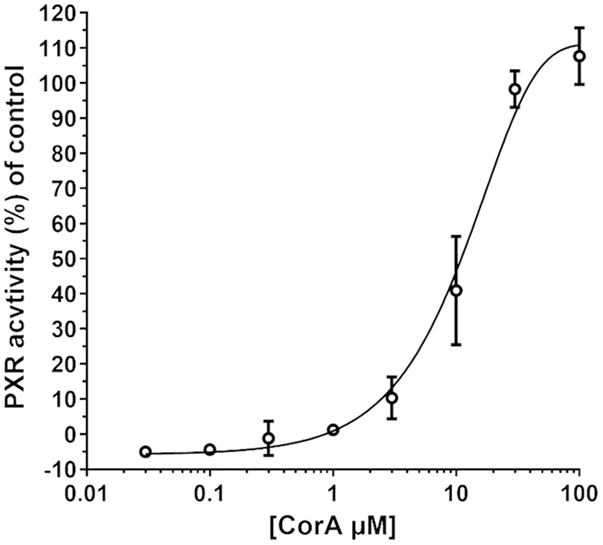 CYP450 induction by PXR was performed and analyzed by Eurofins. Indigo Reporter Cells expressing a hybrid form of human PXR were used: The N-terminal sequence encoding the nuclear receptor DNA binding domain (DBD) has been substituted with that of the yeast GAL4-DBD. Ligand interaction activates the receptor, causing it to bind to the GAL4 DNA binding sequence, which is functionally linked to a resident luciferase reporter gene. Thus, changes in luciferase activity in the treated reporter cells provides a sensitive surrogate measure of the changes in nuclear receptor activity. The nuclear receptor reporter cells were seeded in 96-well plates. CorA (0.003, 0.01, 0.03, 0.1, 0.3, 1, 3, 10 µM), rifampicin and vehicle control (0.1% DMSO) were incubated with the cells at 37°C for 24 hours. Subsequently Luciferase Detection Reagent was added. The intensity of light emission from each sample was quantified using a luminometer.