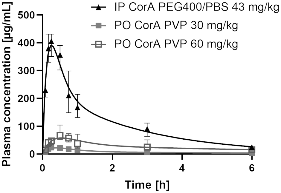 Plasma PK analysis was done using male Sprague Dawley rats at Cyprotex Discovery Limited (Cheshire, United Kingdom). Animals were kept in individual ventilated cages at a 12h light/dark cycle with water and food ad libitum. Rats were treated intravenously (IV) via the tail vein with 0.48 mg/kg (2 ml/kg dosing), PO with 5 mg/kg (5 ml/kg dosing) or IP with 5 mg/kg (2.5 ml/kg dosing). CorA was dissolved in PBS and DMSO in a ratio 90% and 10%. Blood was collected into heparinized tubes with a polyurethane catheter inserted into the jugular vein after 5, 15, 30, 60, 120, 240 and 480 min.