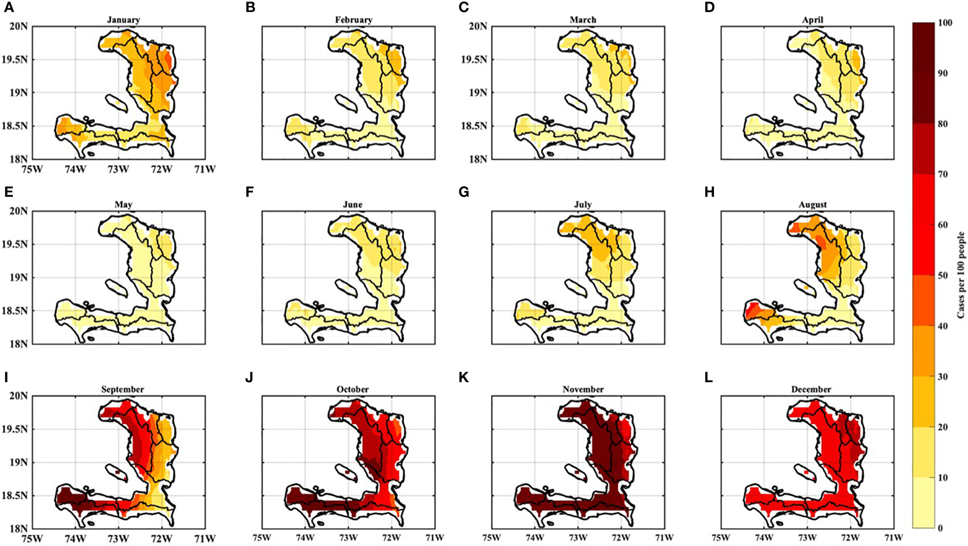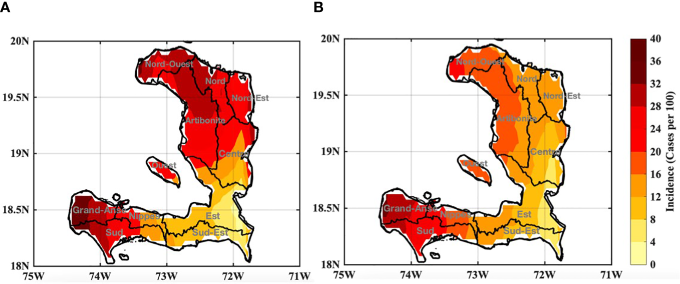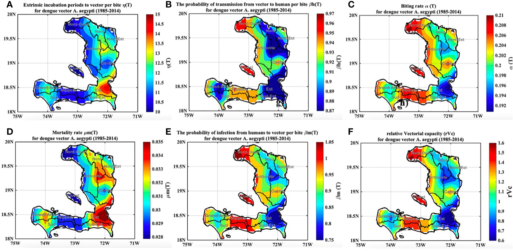 In comparing the results regarding malaria and dengue in Haiti, we can see that both diseases show spatial and temporal variability. In the case of malaria in Haiti, there is a more pronounced signal in the western part of the country compared to the eastern regions. However, significant transmission is evident throughout the entire country. The period from September to December exhibits a notably high incidence signal, reaching its peak in November. On the other hand, dengue is projected to shift from the western regions toward the central areas in Haiti. This suggests that the central regions may witness an increase in dengue cases over time. However, certain areas may experience a decrease in malaria and dengue fever due to reduced rainfall and high temperatures, which can lead to the mortality of adult mosquitoes and a subsequent reduction in disease transmission. It is interesting to note that despite less favorable mosquito-climate conditions in the Eastern departments, both malaria and dengue still occur in these areas. This can be attributed to the regularity of clinical data collection and the presence of healthcare hubs in these regions.