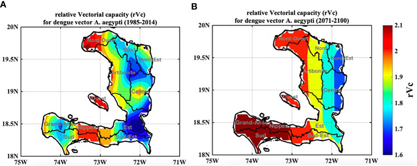 Similarly, the distribution patterns of dengue, closely tied to climatic determinants, are elucidated through the rVc index, which highlights regions at an elevated risk of transmission. However, the potential consequences of climate change introduce the possibility of shifts in dengue’s geographical distribution. These predictions hint at potential reductions in certain departments, driven by the influence of elevated temperatures on vector populations.